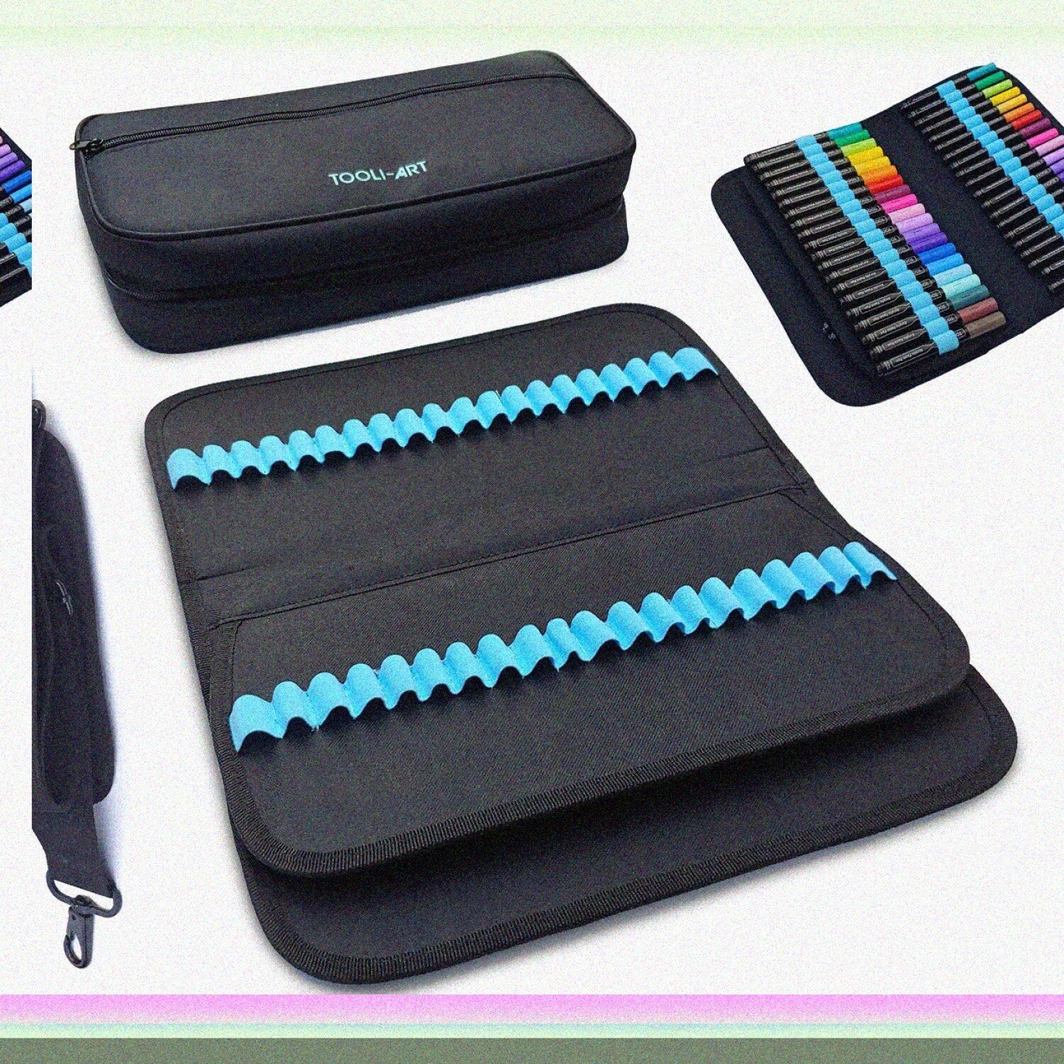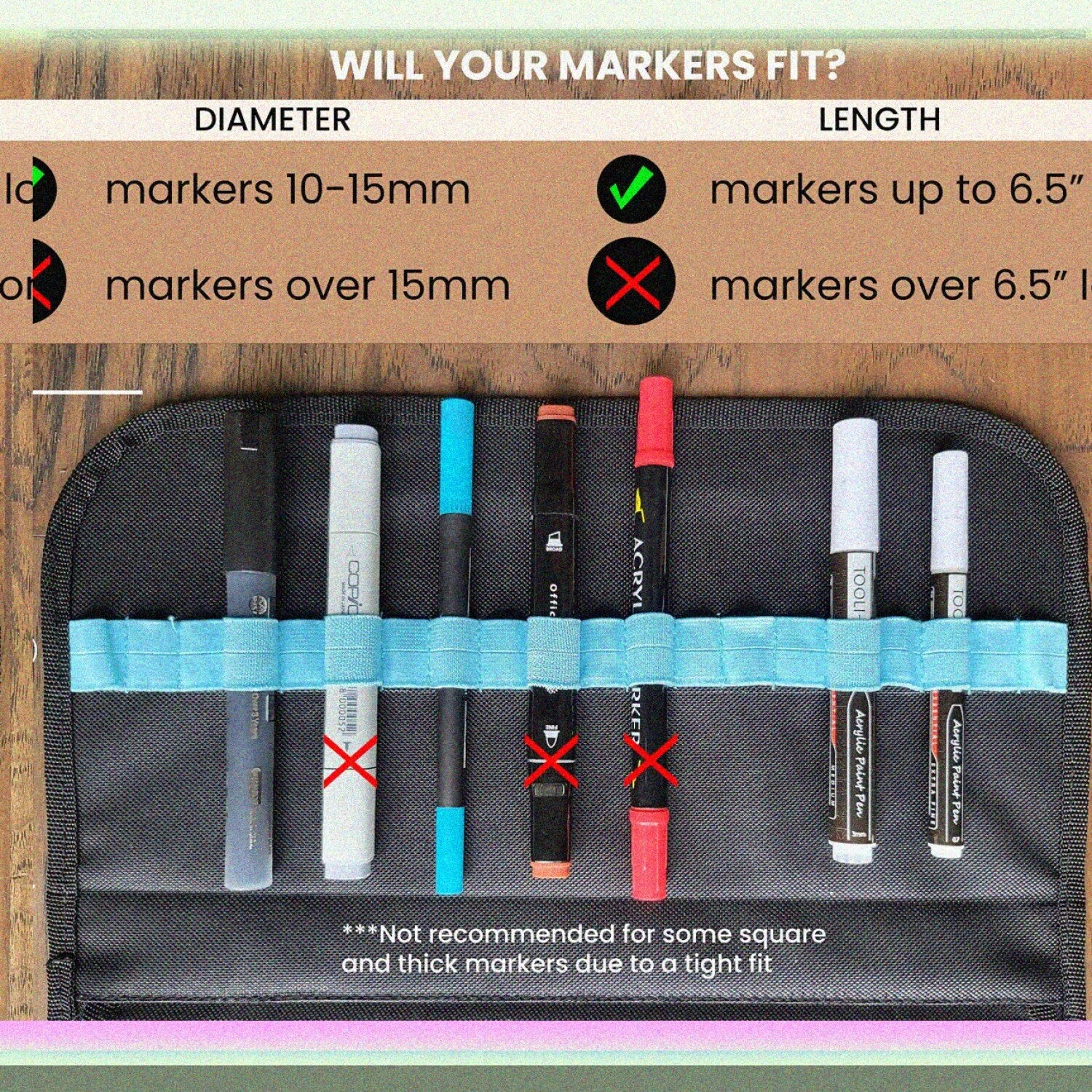 This high-capacity carrying case features 120 stretchable fabric slots designed to organize your markers, pens, or lipstick up to 15mm in diameter. It includes a zippered external pocket and an internal mesh pocket for additional storage. The case is equipped with an integrated carry handle and a detachable shoulder strap with metal connectors for versatile carrying options. A roll-on suitcase travel trolley attachment allows for easy transport during travel. The stretchable slots can securely hold pens ranging from 3/8 inch (10mm) to 9/16 inch (15mm) in diameter; please verify your items' size before purchase, as larger pens will not fit. The case is ideal for those needing to organize a large collection of markers or pens and is suitable for travel and storage. Please note, pens are not included.