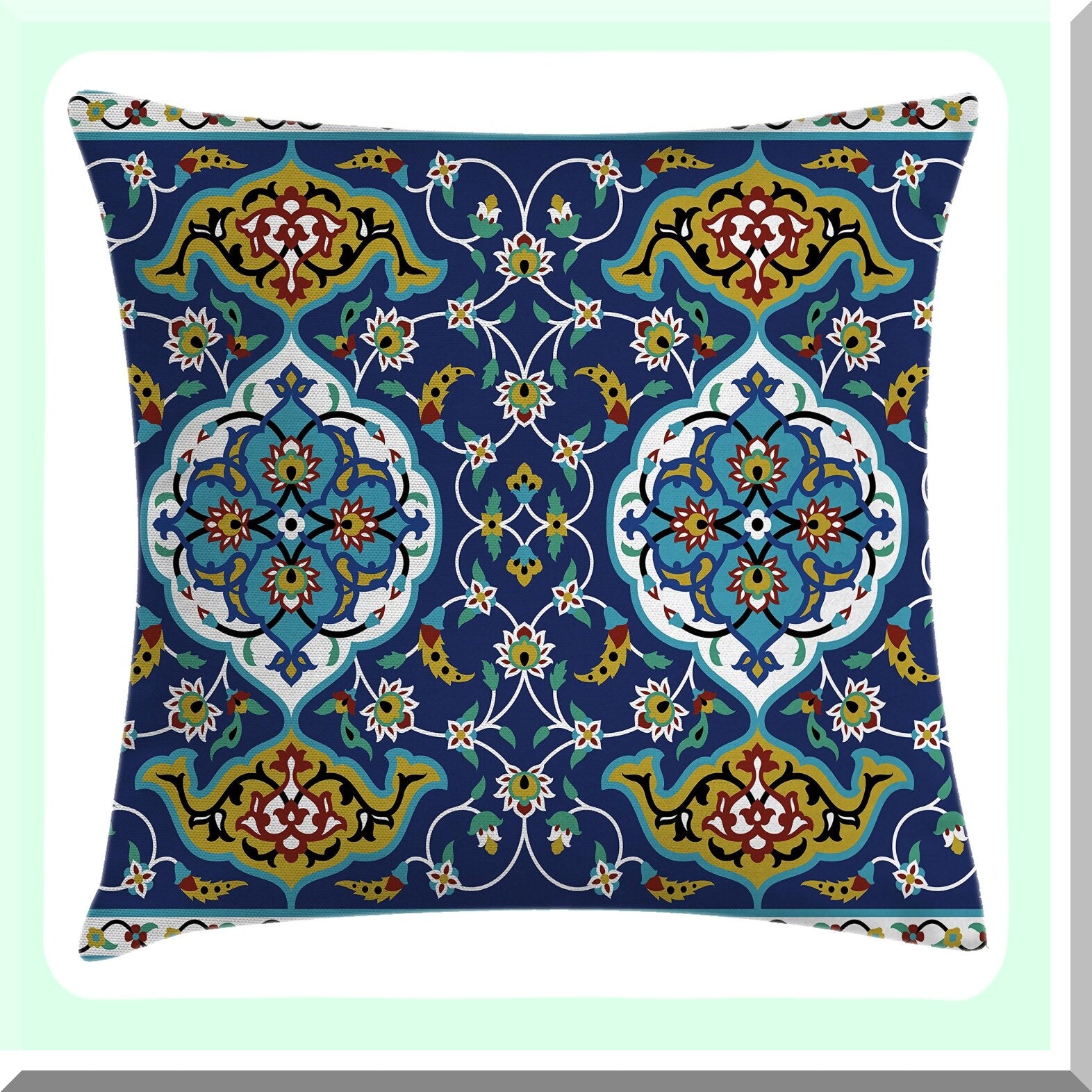 Byzantine Tile Effect Decorative Pillow Cover - Moroccan Oriental Motif Square Cushion Case, 24x24 Mustard Royal Blue Accent Artwork