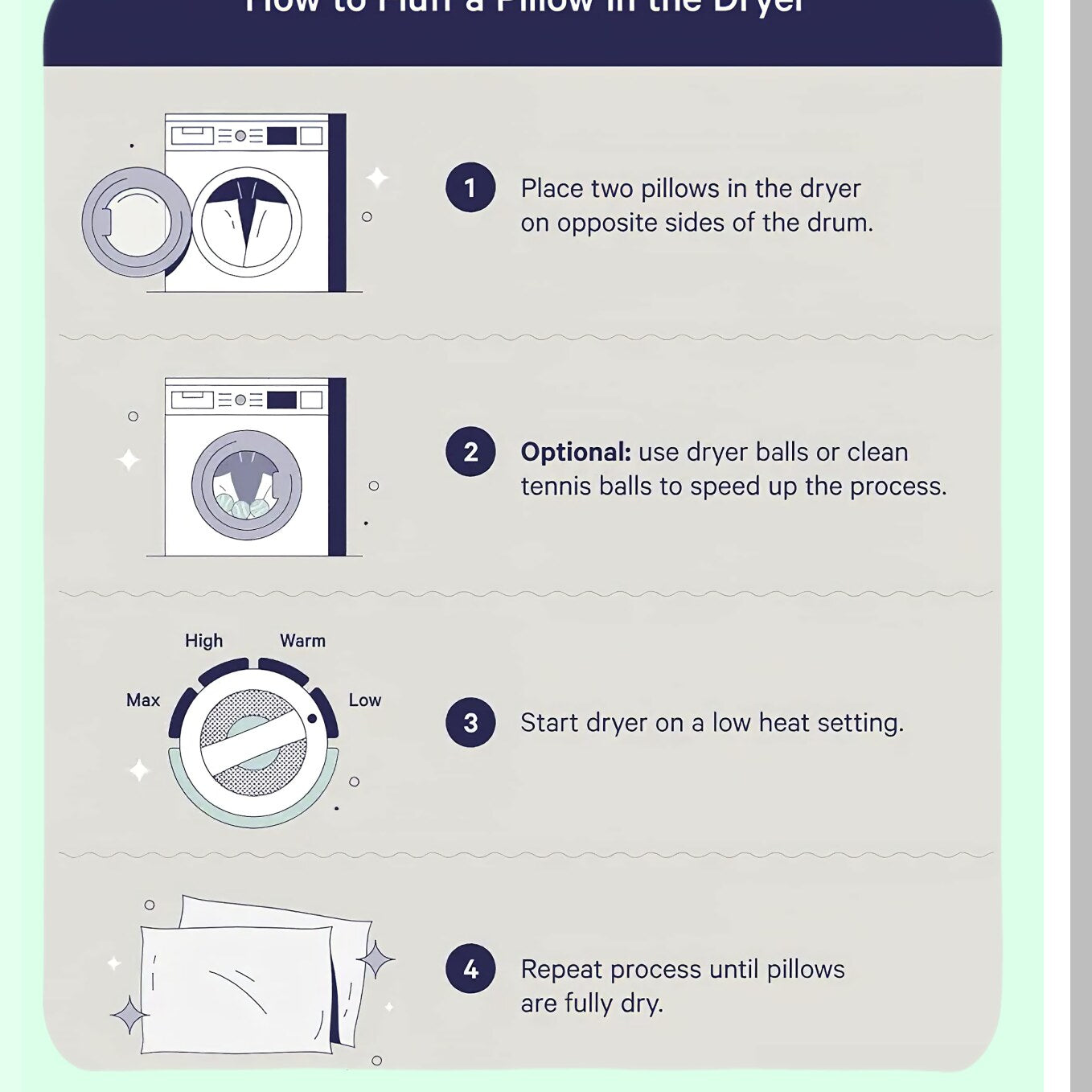 Using a dryer with 2 tennis balls on low heat helps restore the down pillow to its original 5-inch height. This method ensures the pillow maintains its shape and comfort, providing better support and a more restful sleep experience for the user.