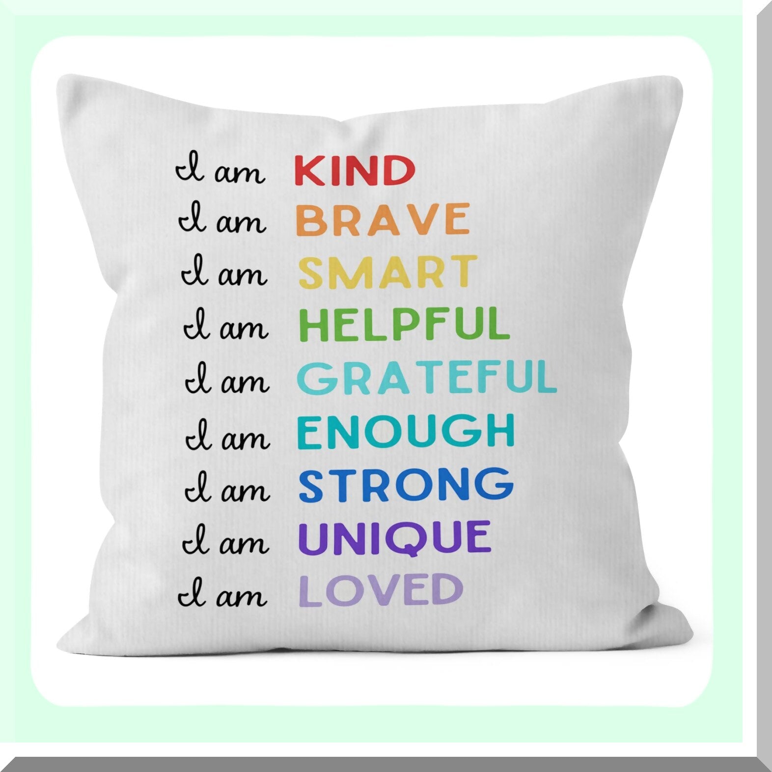 The practical benefits of the inspirational clroom pillow covers include adding a positive and uplifting message to any room, such as a clroom, nursery, or bedroom. The covers are decorative and can enhance the overall decor of the space. They are also versatile and can be used on throw pillows measuring 18 x 18 inches. The message "I Am Kind Loved Enough" can serve as a daily reminder to be kind and love oneself. Overall, these pillow covers can have a positive impact on the user's mindset and create a welcoming environment in the room.
