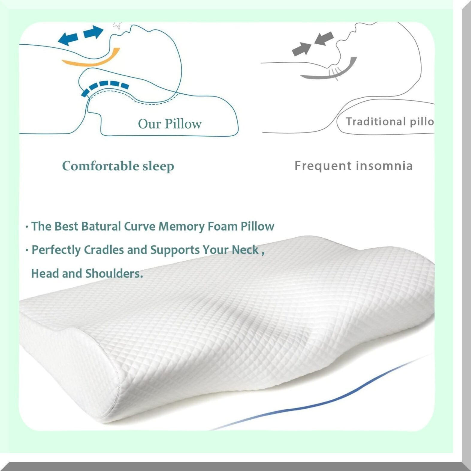 The luxurious sleeping pillow offers therapeutic relief for all sleepers and neck pain, ensuring users wake up feeling fully recharged and ready to take on the day. This product prioritizes user comfort and health, providing a practical benefit by improving sleep quality and reducing neck pain. The pillow's design and materials contribute to a restful night's sleep, ultimately impacting the user's overall well-being and daily productivity.