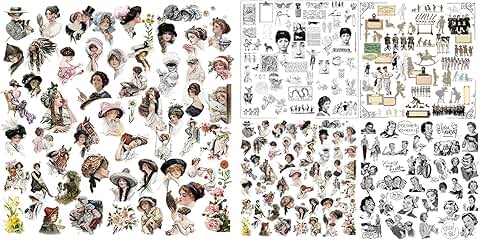 This set includes five packs of junk journal supplies featuring translucent stickers, vintage ephemera, and character-themed elements. The collection offers a variety of items such as retro characters and lady motifs, perfect for enhancing scrapbooking and journaling projects. The supplies are designed to add a nostalgic touch and unique visual interest to your creative work.