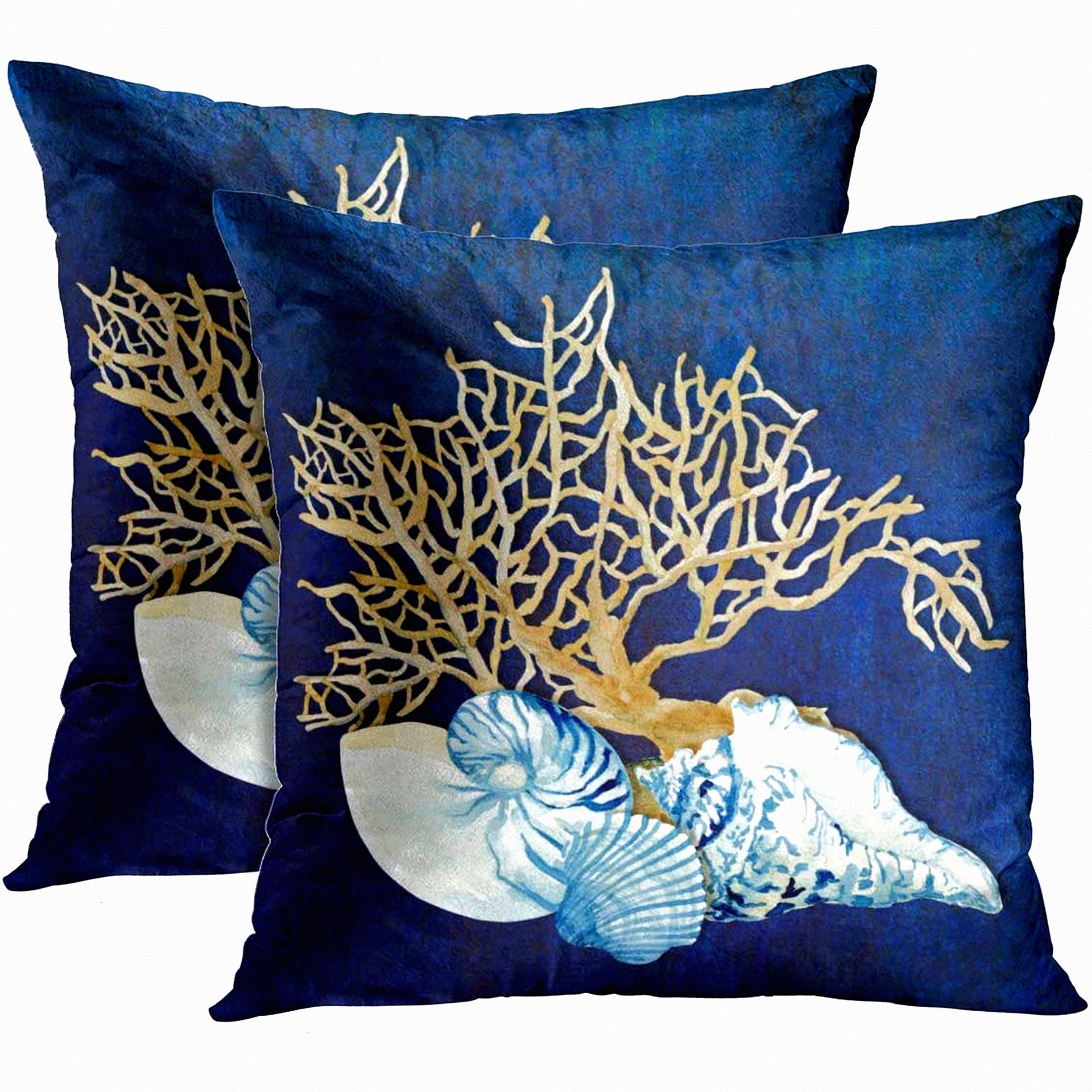 Seashore Indigo Ocean Coral Throw Pillow Covers - Set of 2 | Beach House Gray Coastal Decorative Pillow Cases | Home Decor Square 18 x 18 Inch Pillowcase