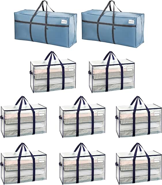This set includes ten heavy-duty moving bags designed for secure storage and transportation. The package features eight oversized clear storage moving bags and two extra-large moving bags, providing ample space for packing various household items. The durable construction ensures strength and reliability during moving or storage. The clear design allows for easy identification of contents without opening the bags. These versatile bags are suitable for organizing clothing, bedding, toys, and other household items, making packing more efficient. The sturdy handles facilitate easy lifting and carrying, while the reinforced seams enhance durability. Ideal for both residential and commercial use, these bags help keep belongings organized and protected during transit or storage. Their large capacity and robust build make them a practical solution for managing bulky or numerous items, simplifying the moving process and reducing the risk of damage.