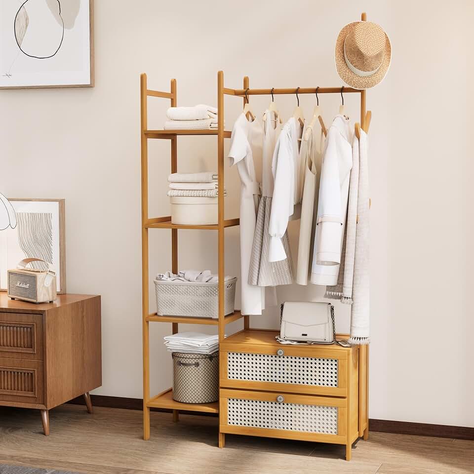 This bamboo clothes rack features a practical design with five tiers of storage, including shelves and drawers, providing ample space for organizing clothing and accessories. It is equipped with six hanging hooks, ideal for hanging coats, bags, or scarves. The rack measures 31.5 inches in width and has a natural finish, adding a warm, organic touch to any room. The inclusion of a rattan door enhances its aesthetic appeal while offering additional enclosed storage. Suitable for entryways, guest rooms, kids' bedrooms, or closets, this versatile piece helps maximize space and maintain organization. Its sturdy bamboo construction ensures durability and stability, making it a functional addition to various living spaces. The combination of open shelves, drawers, and hooks offers flexible storage options, making it easy to keep belongings tidy and accessible. This rack blends practicality with natural style, making it a useful and attractive storage solution.
