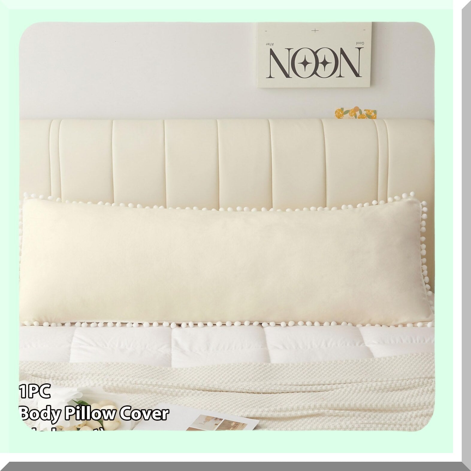 Velvet Fringe Plush Body Pillow Cover - Soft Microfiber Pillowcase with Zipper - Luxury Decorative Beige Bed Pillow Protector - Cute Pom Poms