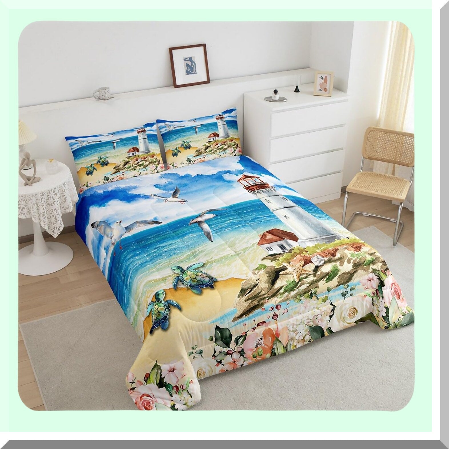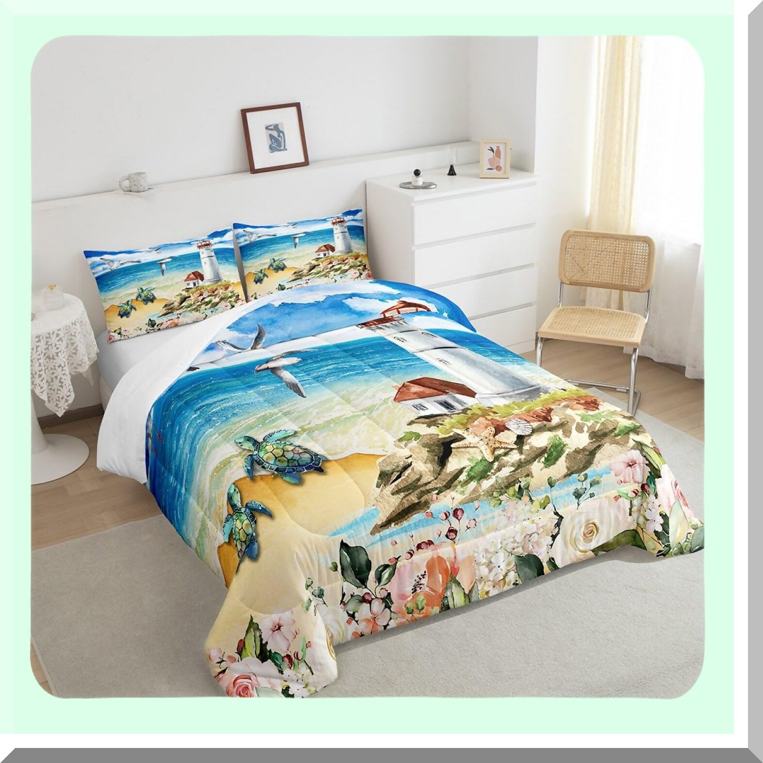 Ocean Breeze Queen Comforter Set - Beach Turtle & Bird Bedding with Starfish & Shell Design - Colorful Floral Duvet Insert with 2 Pillowcases for Women