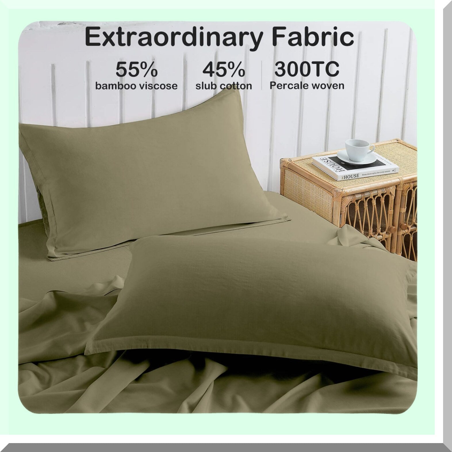 Bamboo Cotton Cool Sheets Set - Twin Size | Soft & Breathable | Durable Natural Bedding | Olive Green Linen-Textured | Hot Sleeper Friendly | 15" Deep Pocket | 3 Piece