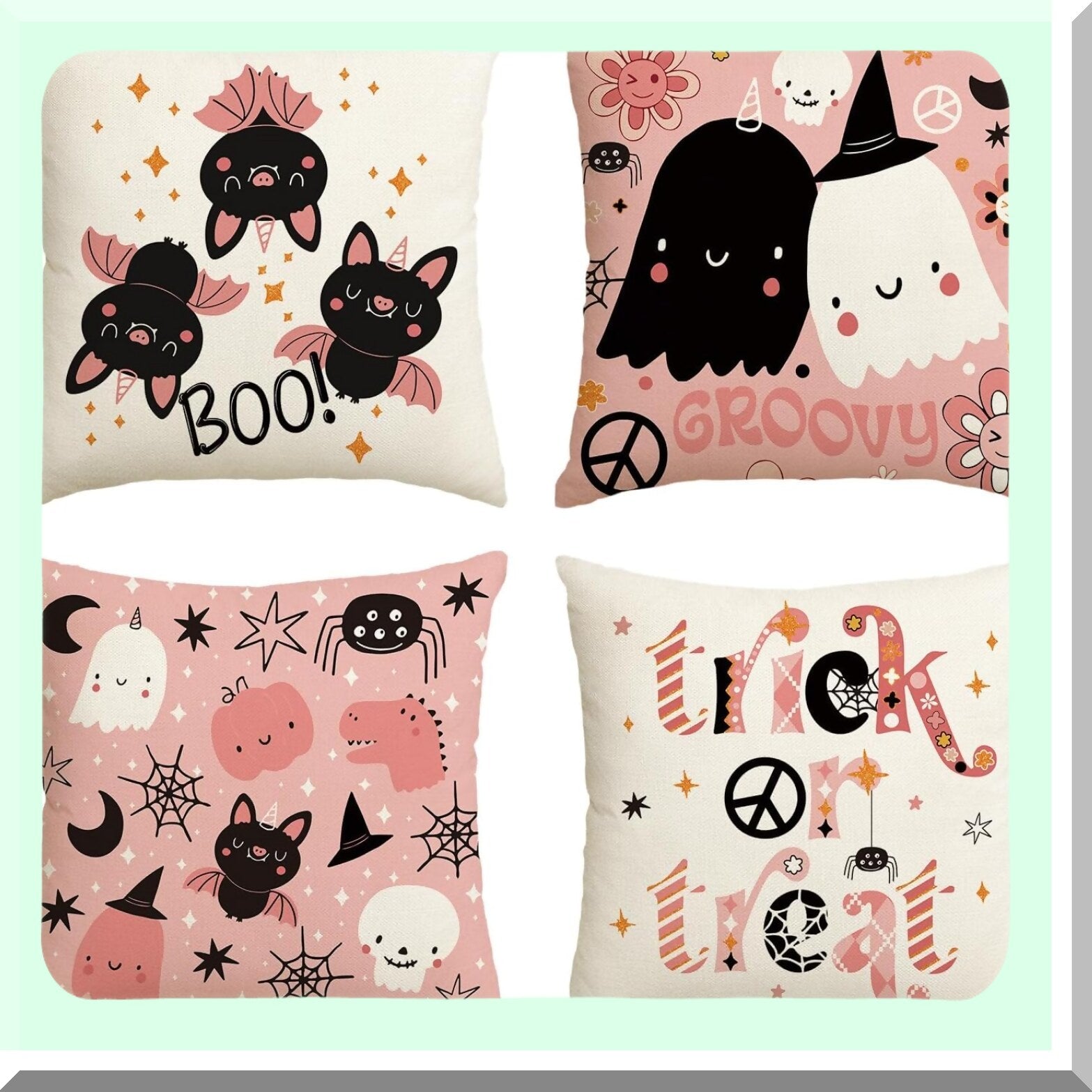 Spooky Chic Halloween Pillow Covers - Set of 4, 20x20 Inch Ghost Skeleton Bat Flower Cushion Cases for Sofa, Trick or Treat Pink Throw Pillows