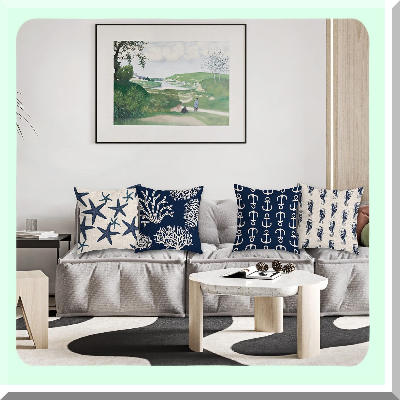Starfish Coral Seahorse Anchor Nautical Pillow Covers - Set of 4, Ocean Theme Decorative Throw Pillow Cases for Home Sofa, Sea Animal Gifts 18 x 18 Inch