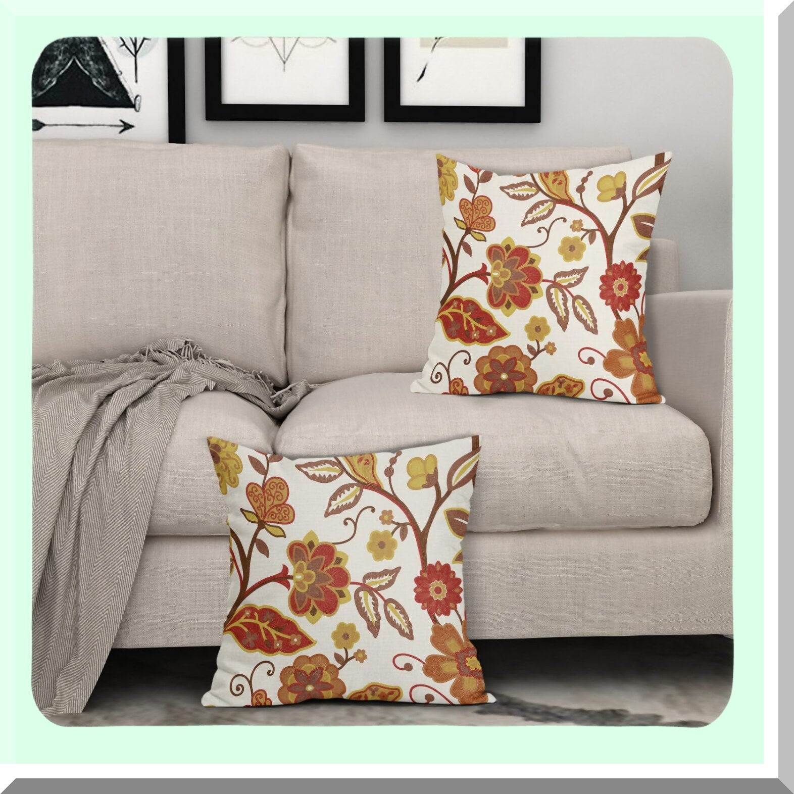 Autumn Bloom Pillow Covers - Set of 2 Red Yellow Burnt Orange Flower Print Throw Pillows - Outdoor Decorative Cushion Cases for Home Couch Sofa Bed - Farmhouse Fall Floral Linen Square Decor