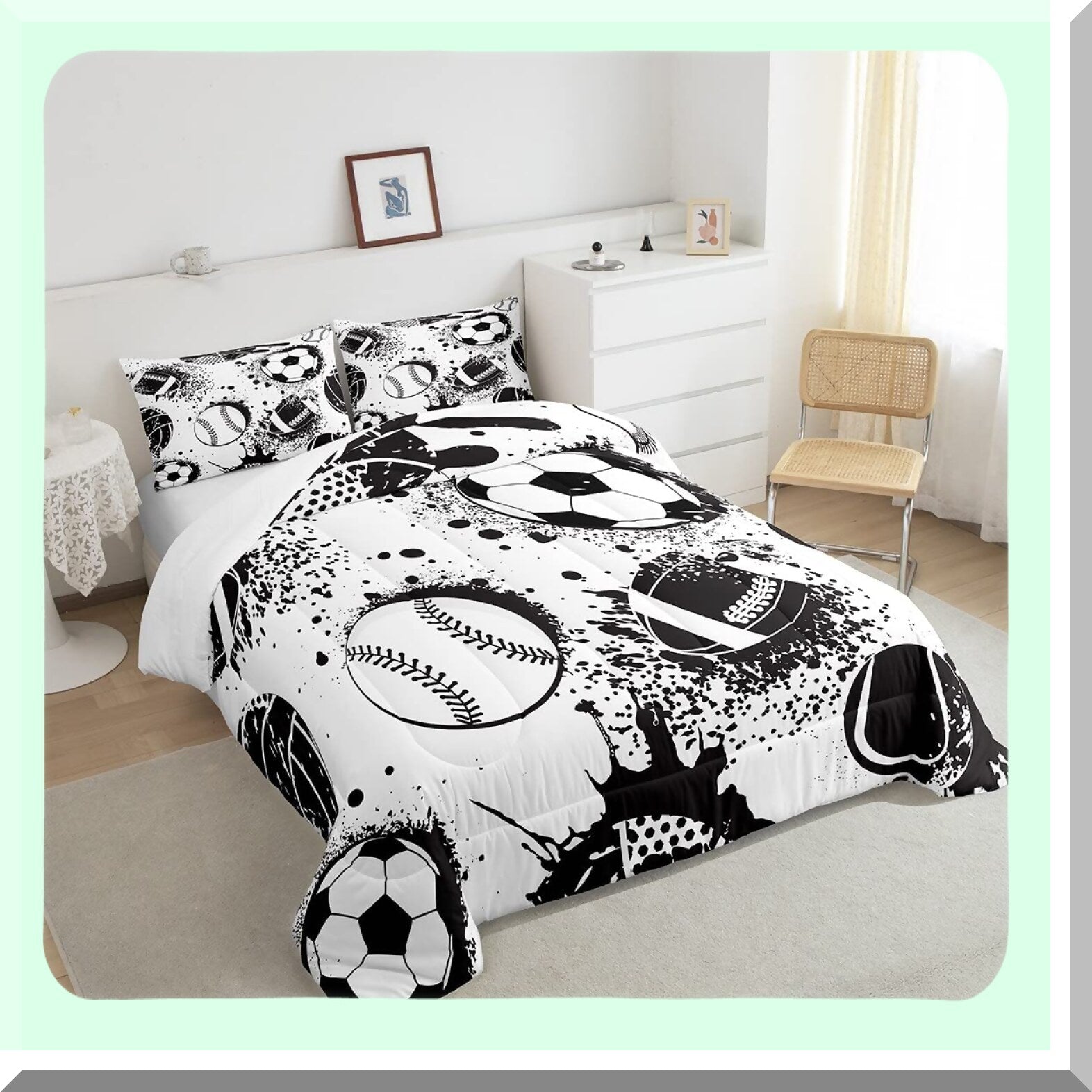 Sports Game Comforter Set - Queen Size | Basketball Baseball Football Hip Hop Graffiti Art Duvet Set | Black White Room Decor Bedding