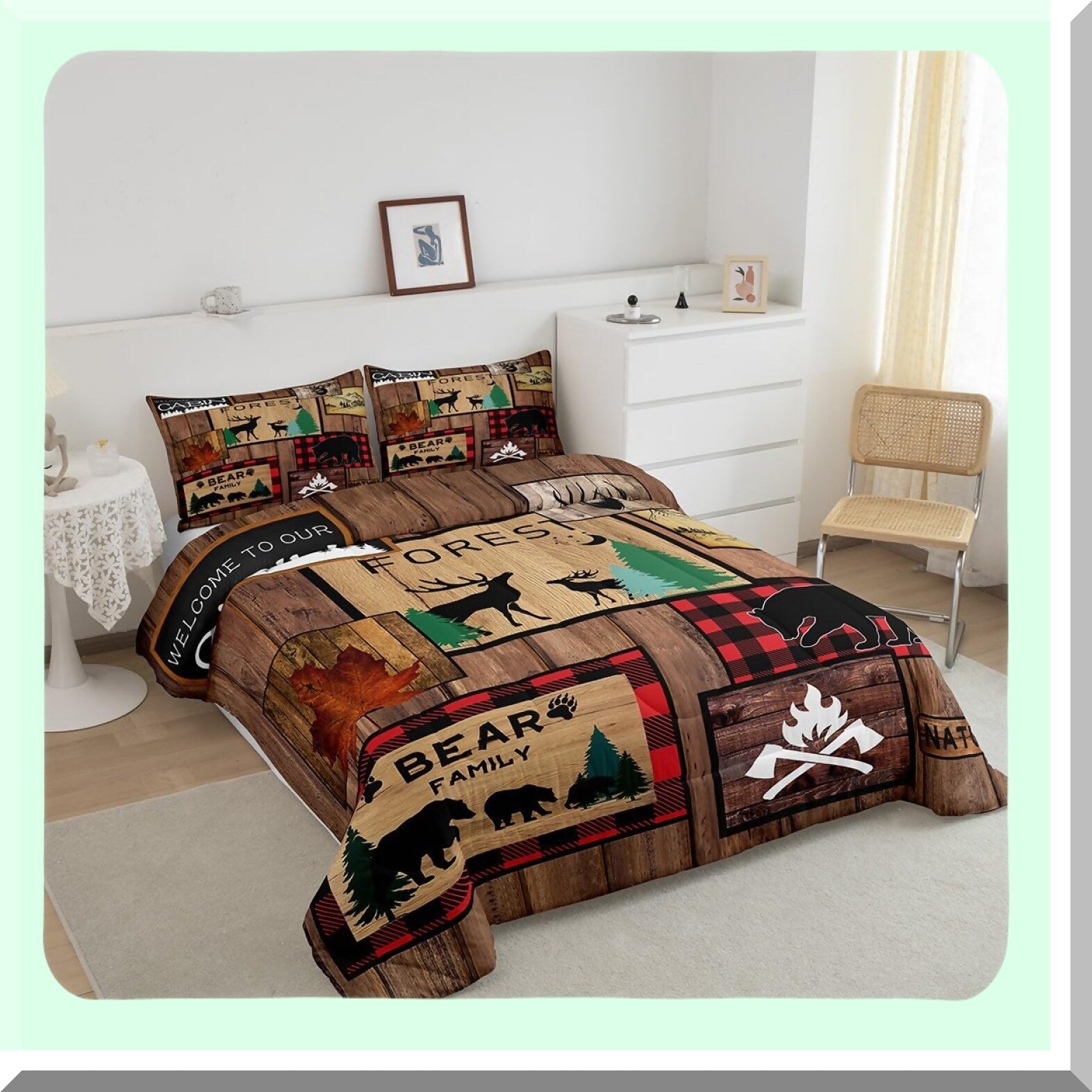 Wilderness Retreat Queen Comforter Set - Rustic Adventure Bear & Deer Bedding - Hunting Wildlife Duvet Insert - Plaid Lodge Farmhouse Quilt - Western Country Room Decor - Black & Red Lattice