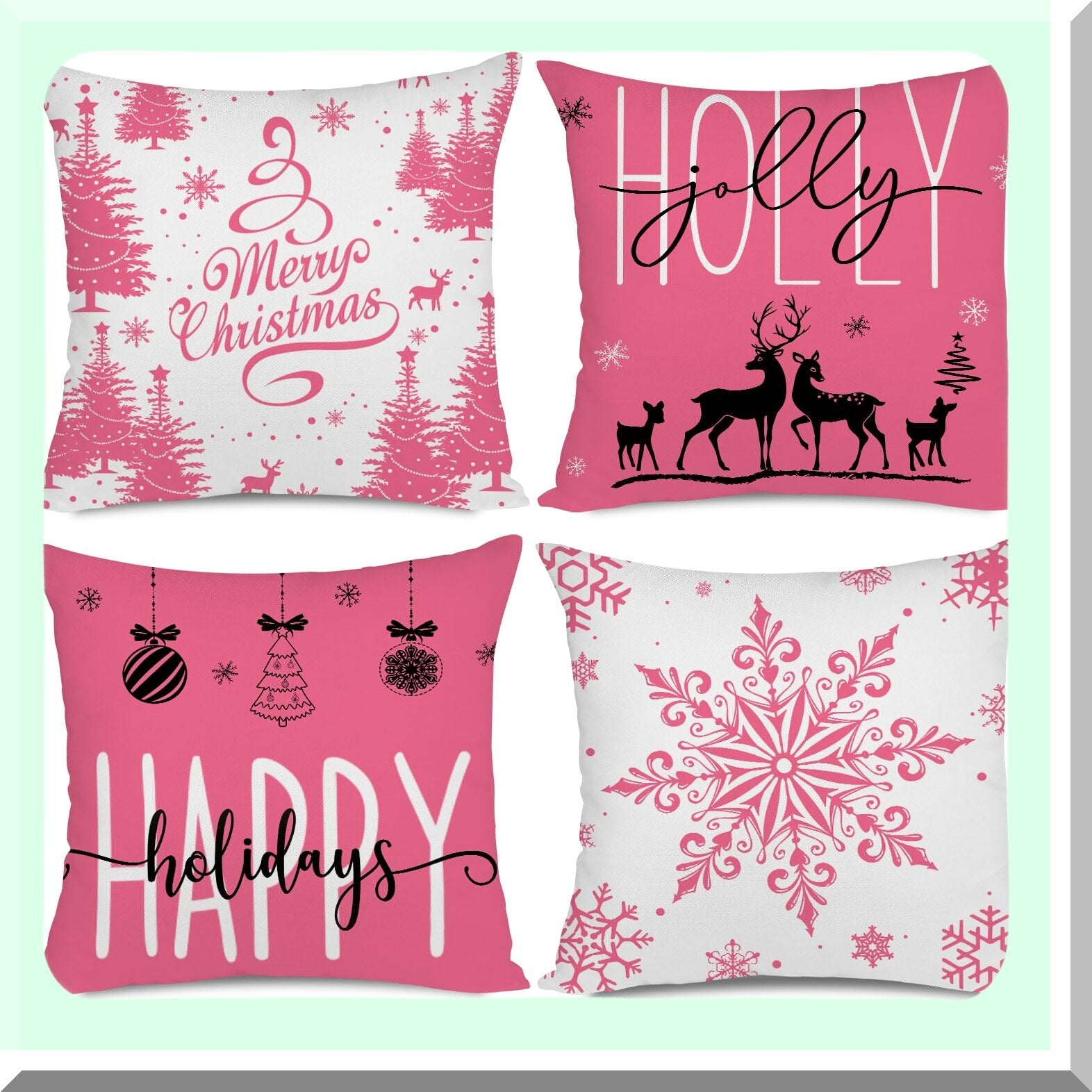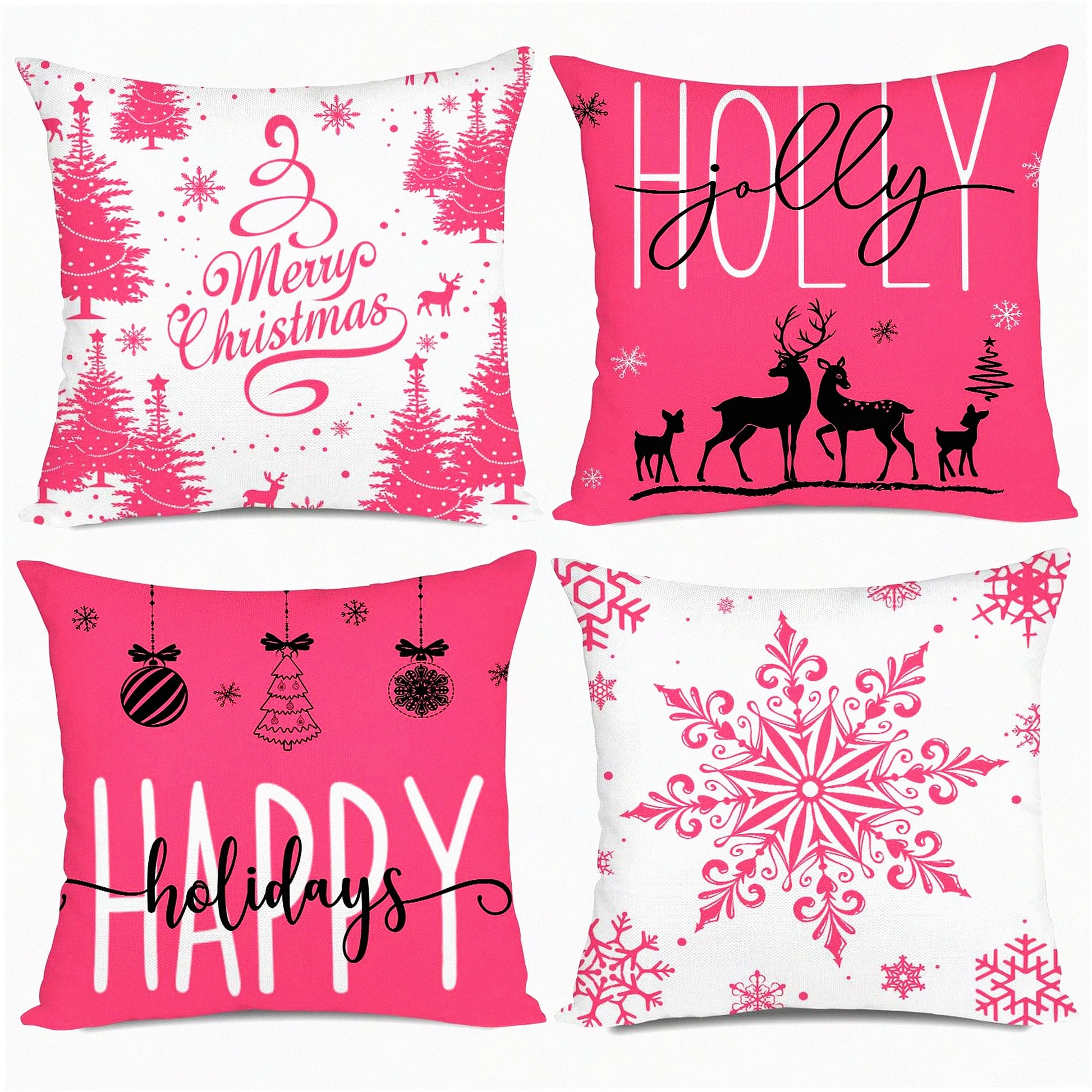 Holiday Cheer Farmhouse Pillow Covers - Set of 4 Snowflake Merry Decor Cushion Cases 20x20 for Couch Sofa in Pink. Add some Holly Jolly vibes to your home decor this season!