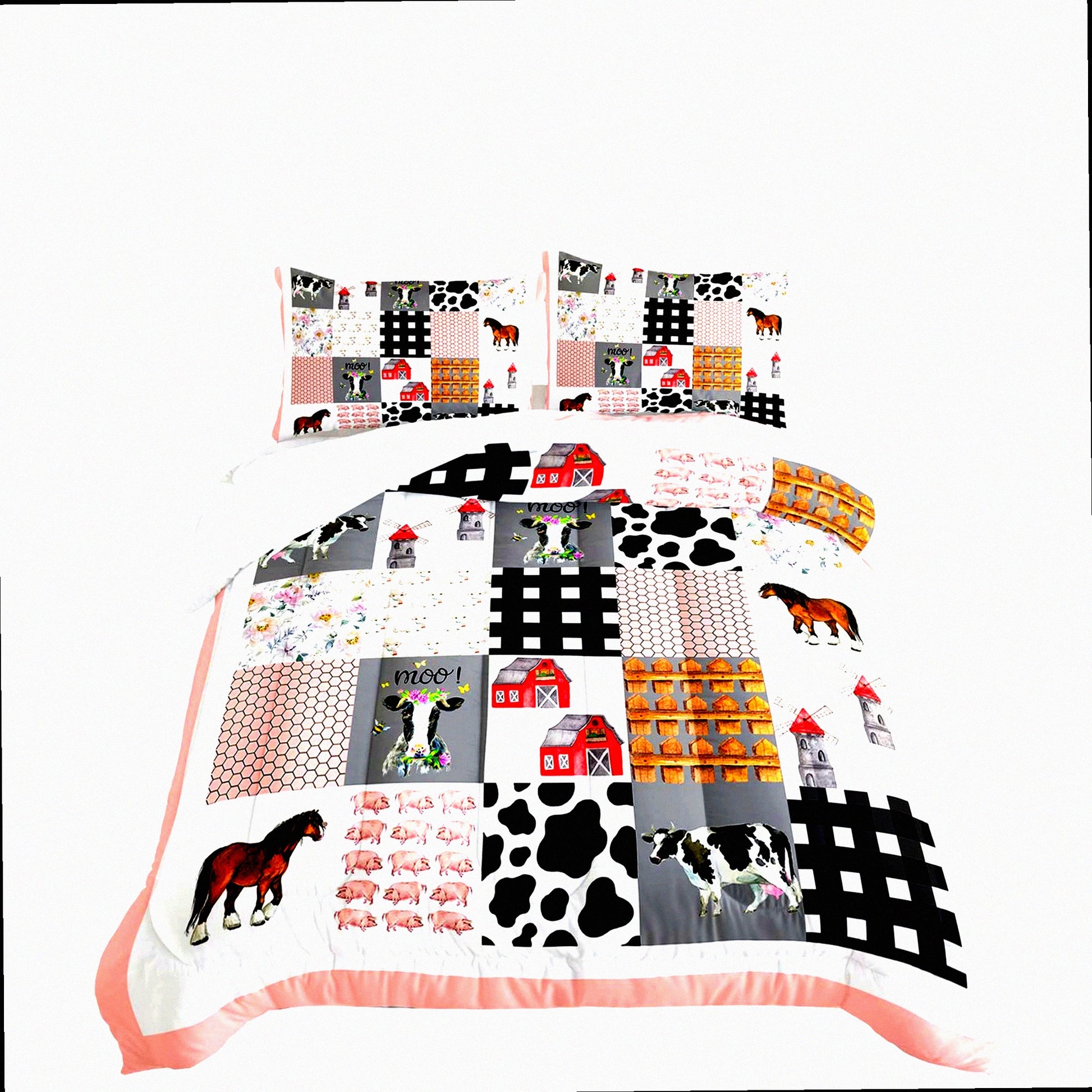 Farmhouse Animal Print Queen Comforter Set - Western Country Style Room Decor - Cute Cartoon Pig Cow Horse - Pink White Grid Comforter - Aesthetic Bedroom Decor