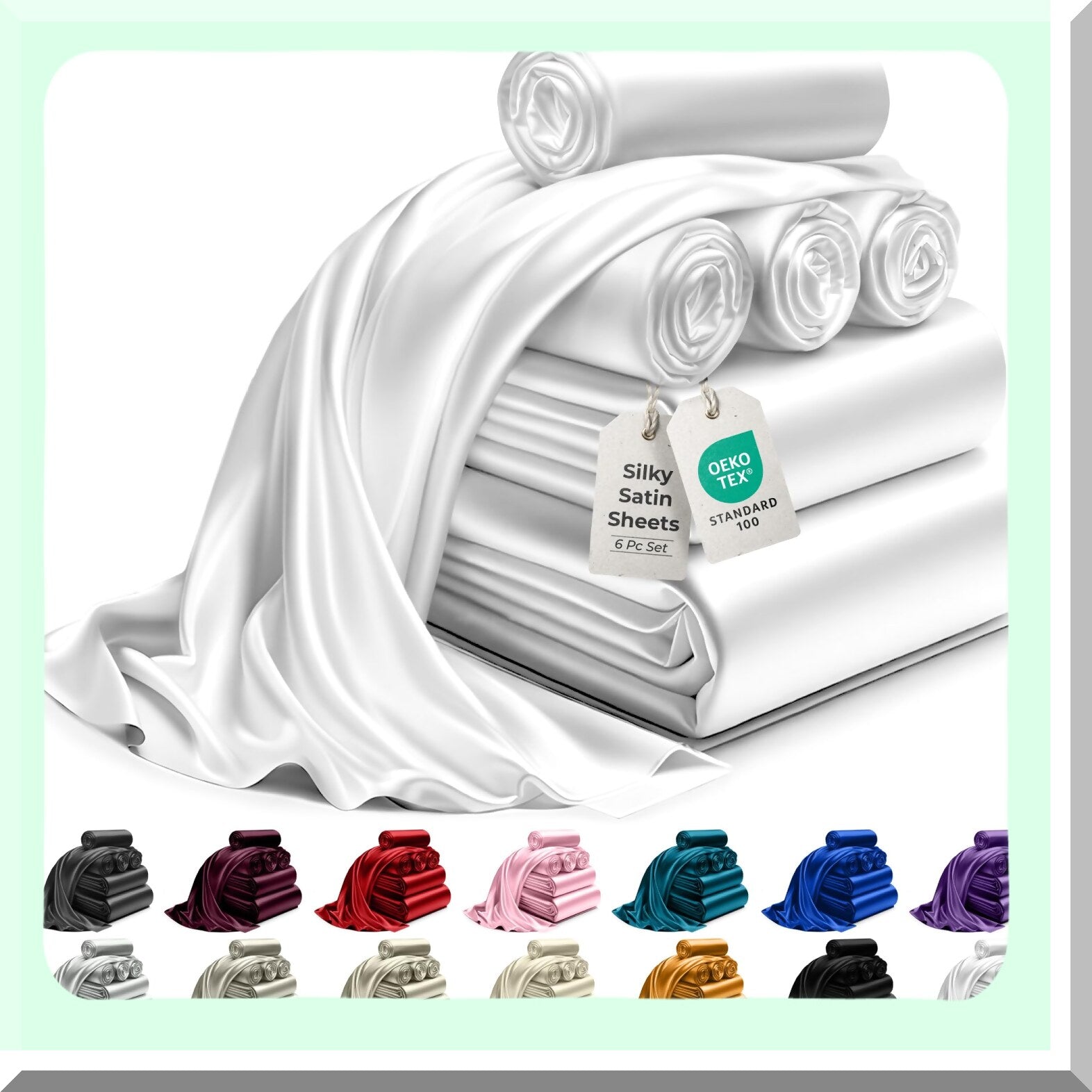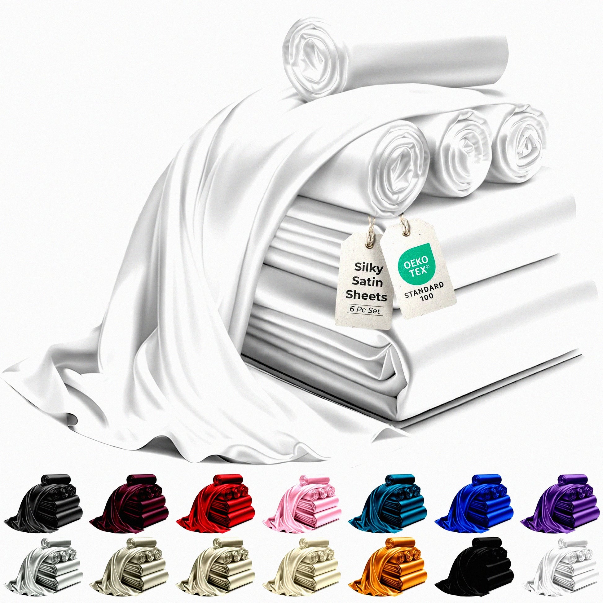 SilkLux Queen Bed Set - 6pcs Luxurious All-Season Silky Soft Sheets for Elegant and Comfy Sleep Experience. Wrinkle-Free White Bedding Set.