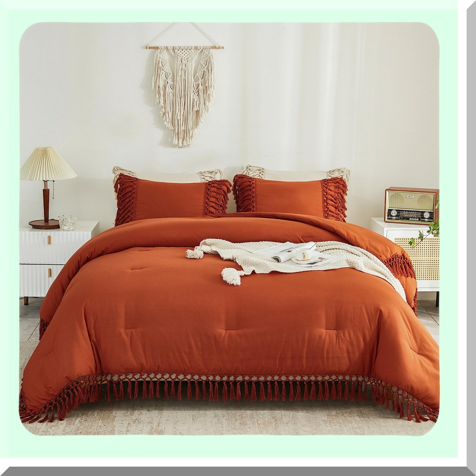 Transform your bedroom into a vibrant oasis with the Boho Tel Comforter Set. The unique boho tel design in solid colors exudes a charming and cute vibe, adding a touch of elegance to your room's dcor. Experience ultimate comfort and style with this simply stylish set, perfect for creating a cozy and inviting atmosphere in your space. Elevate your bedroom with this one-of-a-kind set that will surely make a statement.