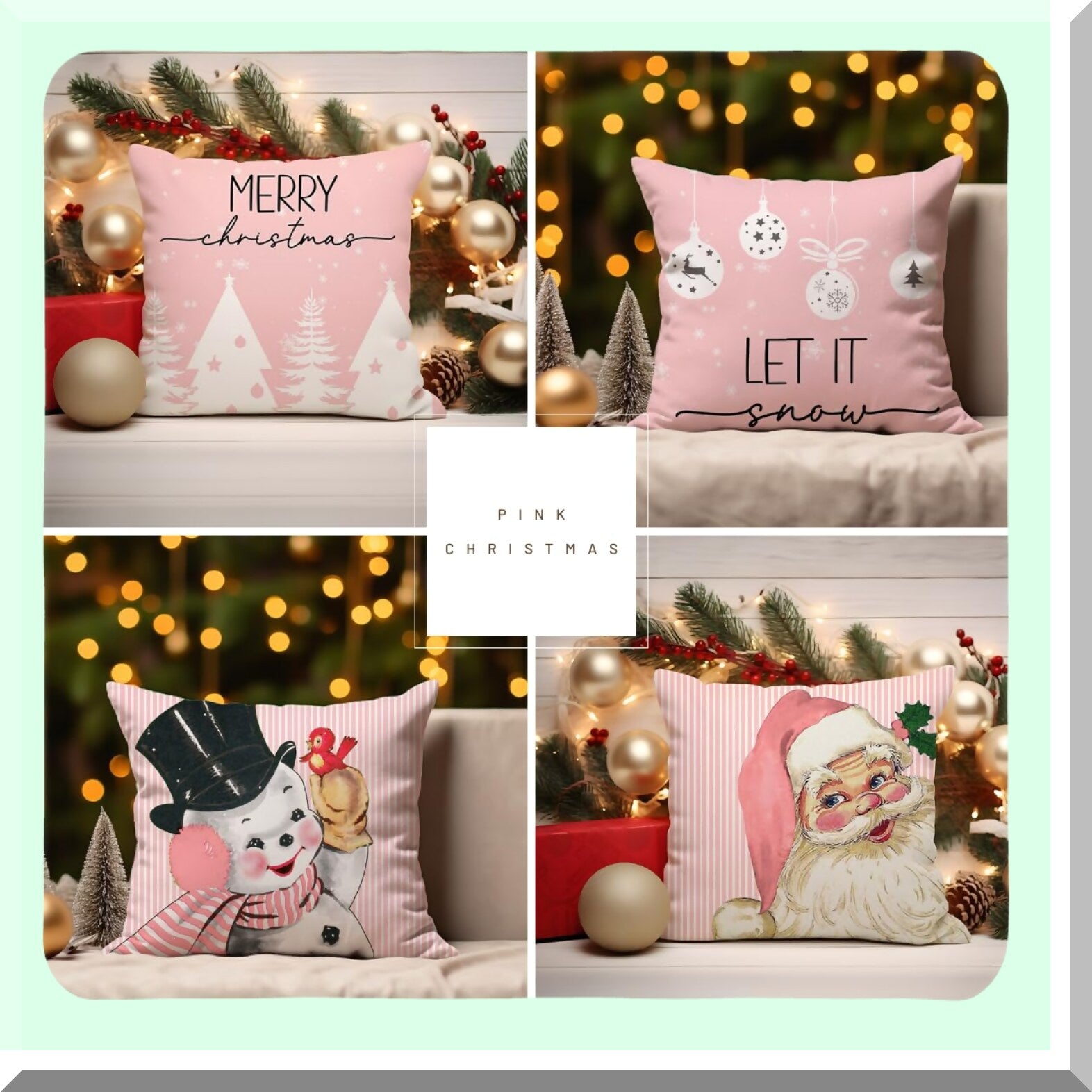 Winter Wonderland Pillow Covers - Set of 4 Pink Stripes Snowman Snowflake Merry Tree Decorations. Let It Snow Hello Winter Holiday Pillows for Sofa.