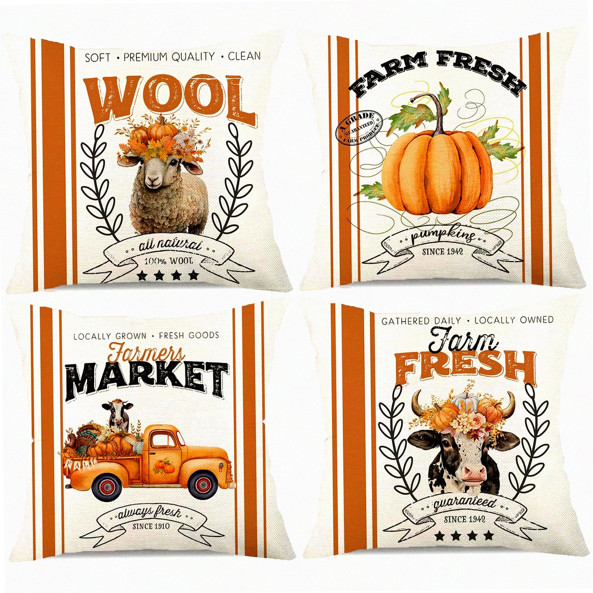 Autumn Harvest Farmhouse Pillow Covers - Set of 4 Retro Stripes Farmer's Market Truck Turkey Cow Sheep Pumpkin Floral Decorative Cushion Case