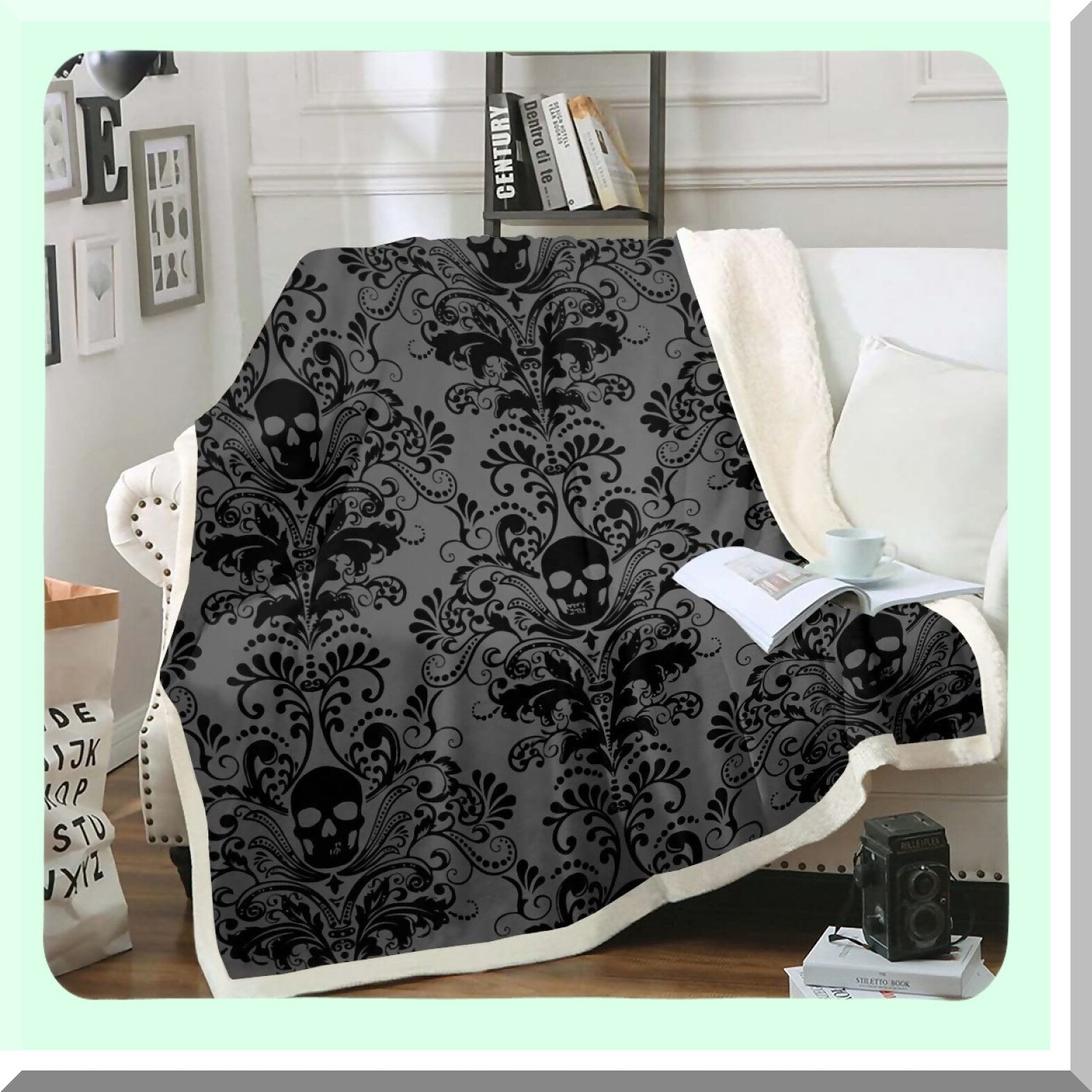 Victorian Gothic Floral Fleece Throw - Antique Black Damask Blanket with Exotic Sugar Skull Design, 50"x60""