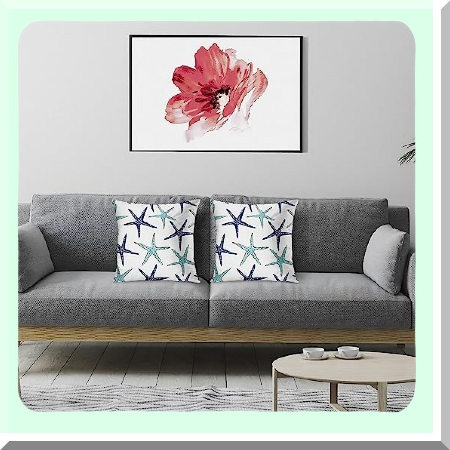 Starfish Coastal Green Blue Throw Pillow Covers - Set of 2 Decorative Cases for Home Decor, Standard Square 24x24 Inches Summer White Pillowcases - Beach Ocean Theme