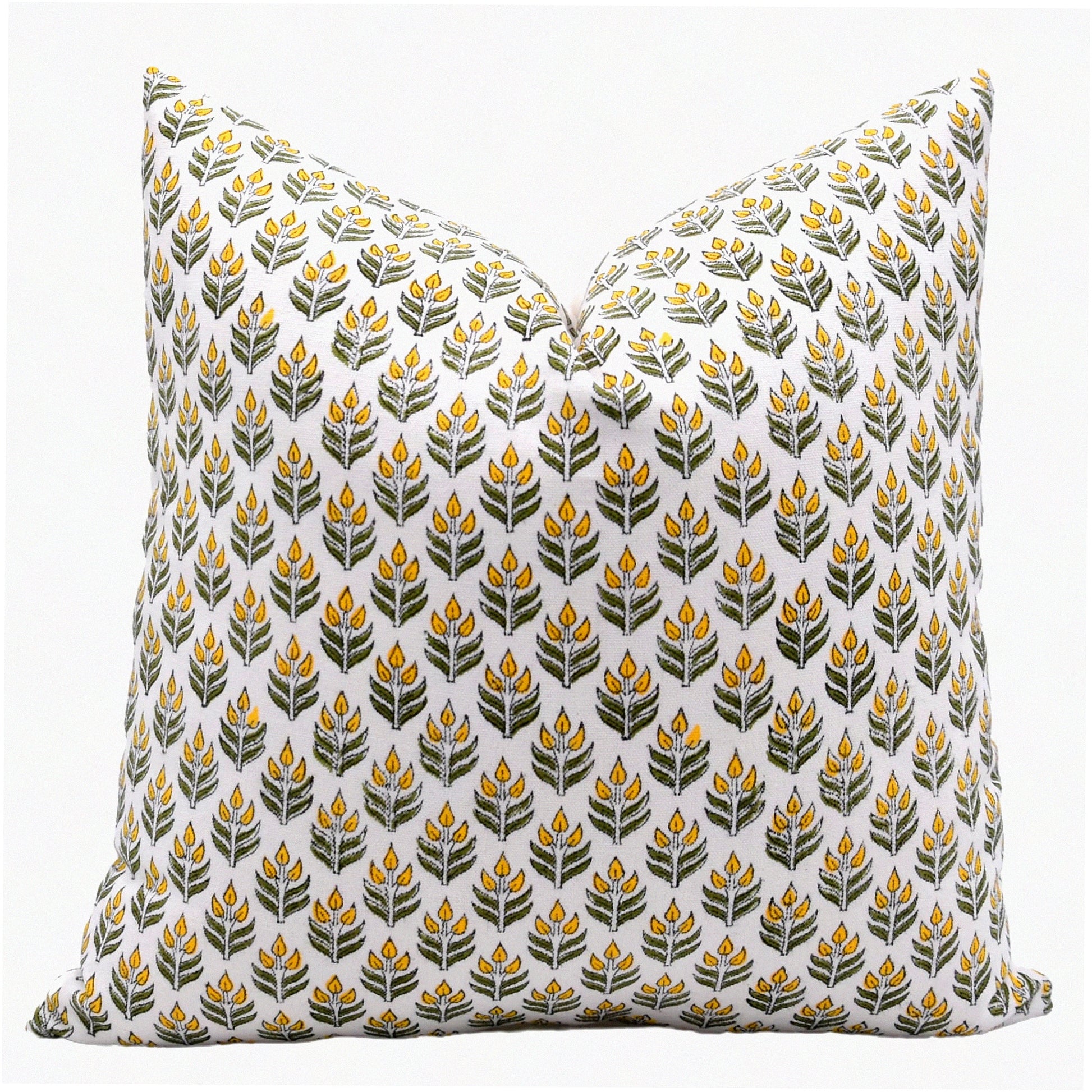 Boho Chic Floral Block Print Cushion Cover - Vintage White Cotton Throw Pillow Case for Sofa & Couch - 16x16 Yellow Outdoor Decor - Aliya Collection