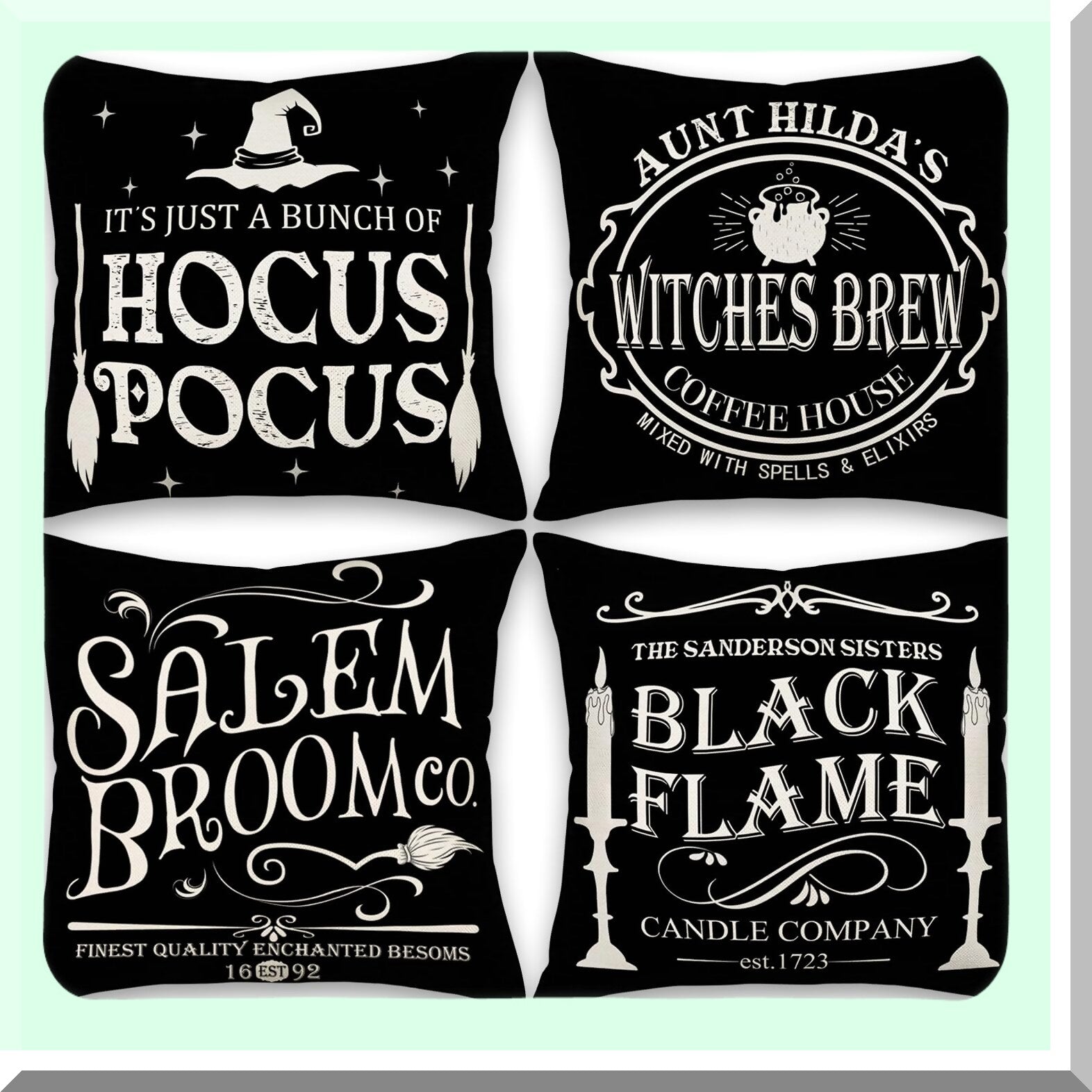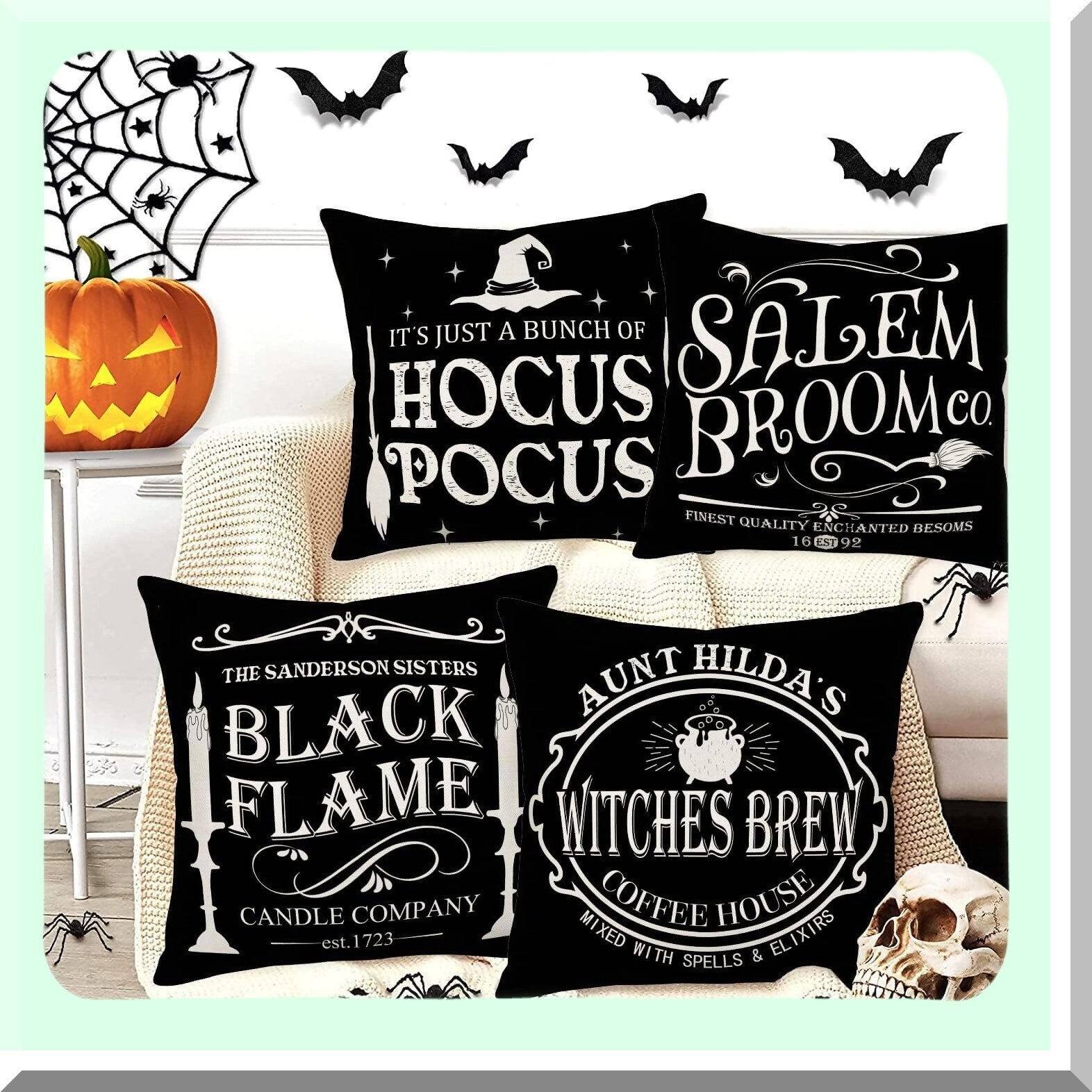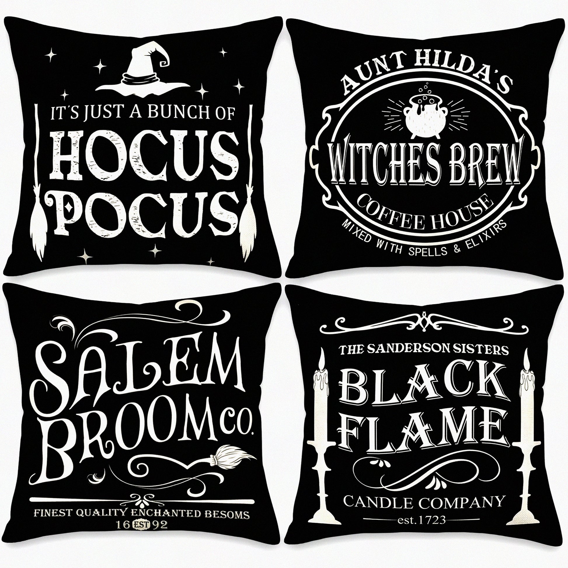 Hocus Pocus Farmhouse Quote Pillow Covers - Set of 4 Decorative Fall Cushion Cases for Home Decor - Black 24x24 Inch Outdoor Throw Pillows