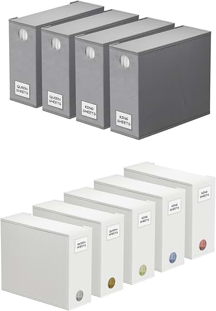 This set includes four gray and five white foldable bed sheet organizers designed for efficient storage. Made from durable materials, these organizers help keep bed linens neatly arranged and easily accessible. Their foldable design allows for compact storage when not in use, making them ideal for linen closets or drawers. The organizers feature multiple compartments to separate different types of bedding, such as sheets, pillowcases, and duvet covers. Their sturdy construction ensures they maintain their shape over time, providing a tidy and organized appearance. These versatile storage solutions are suitable for use in bedrooms, linen closets, or laundry rooms. They help maximize space and simplify the process of finding and storing bedding essentials. The neutral gray and white colors blend seamlessly with various decor styles, adding a clean and organized look to any storage area. These sheet organizers are practical, space-saving, and easy to use, making linen management more convenient.