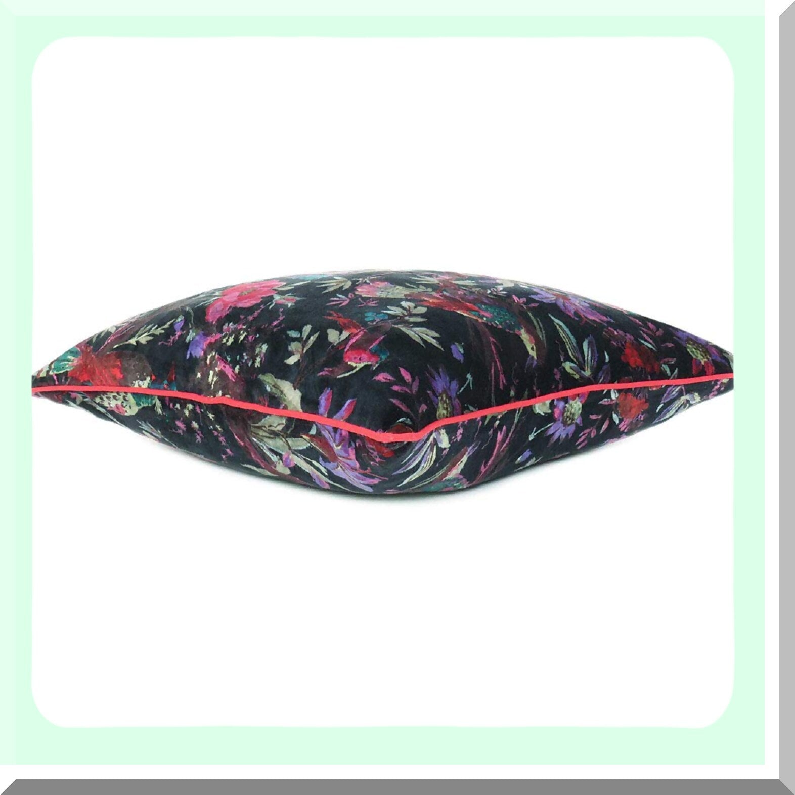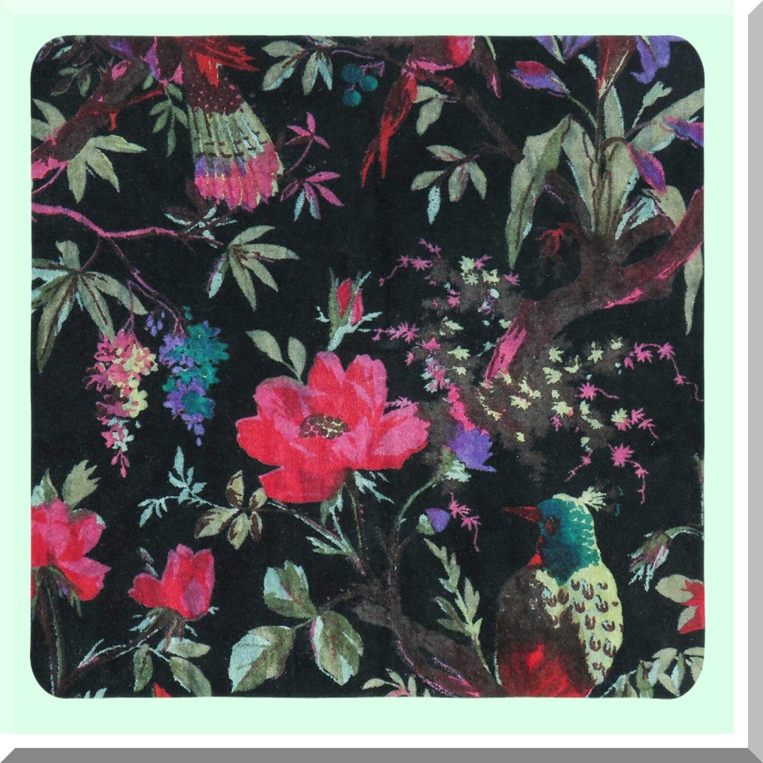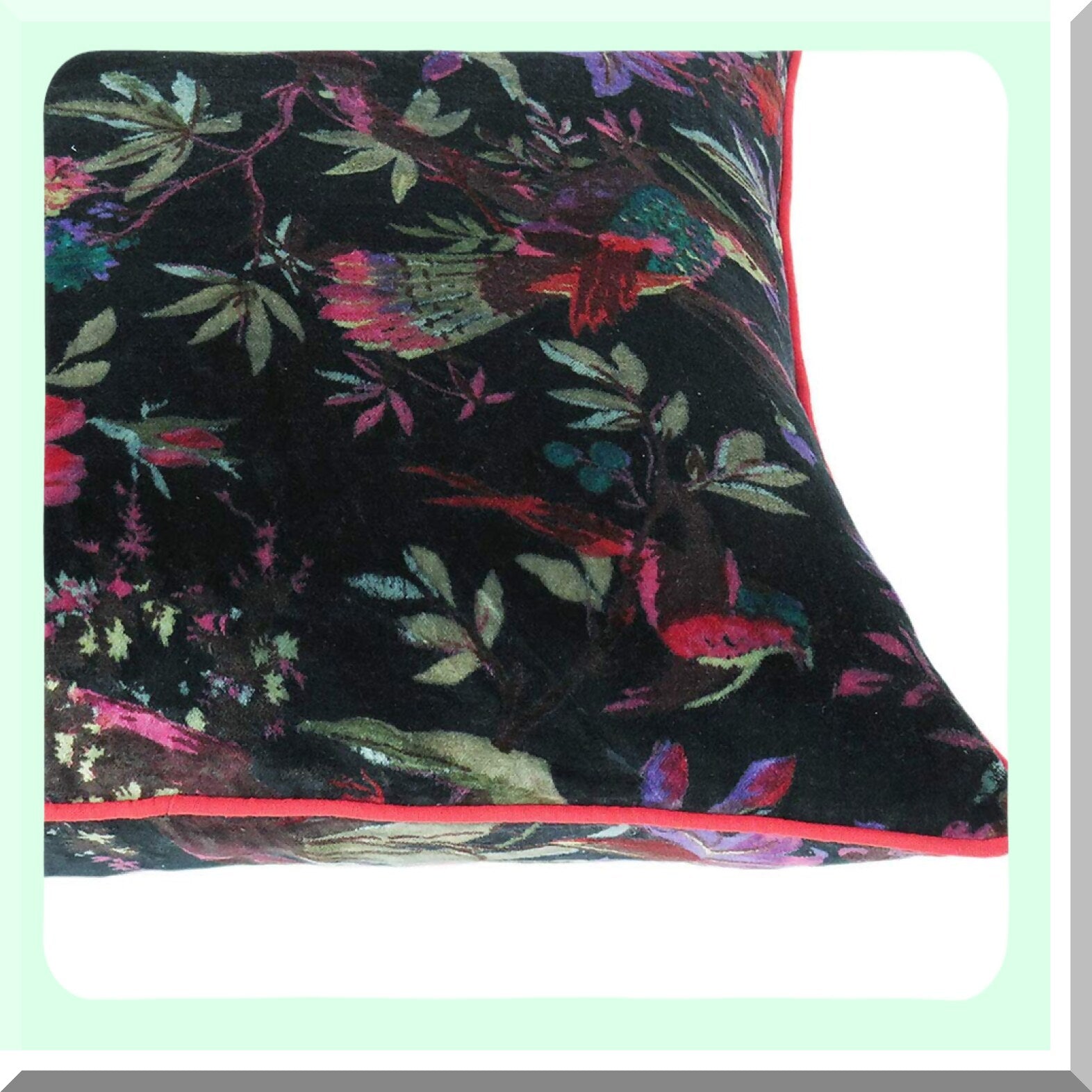 Boho Bird Print Velvet Cushion Cover - Colorful Floral Accent Throw Pillow Case for Sofa Couch - Bohemian Living Room Decor - 16x16 Inch Black