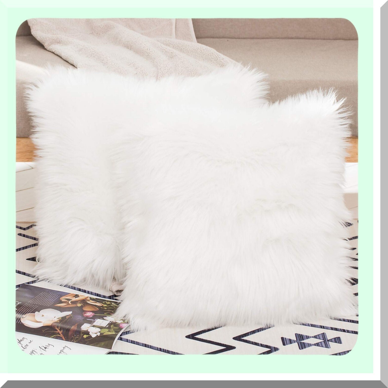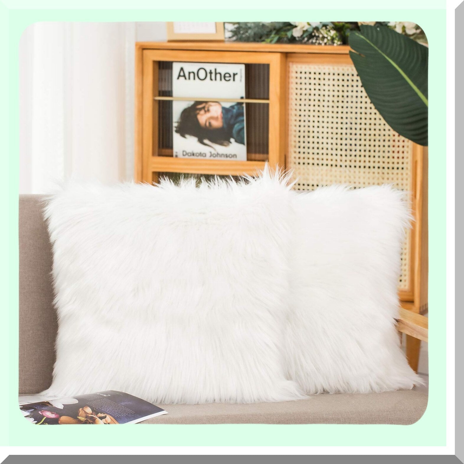 Fluffy White Square Pillow Covers - Soft Fuzzy Cushion Cases for Sofa, Couch, Bed - Decorative Throw Pillows Set of 2 - 18 x 18 Inches - Cafe Chic