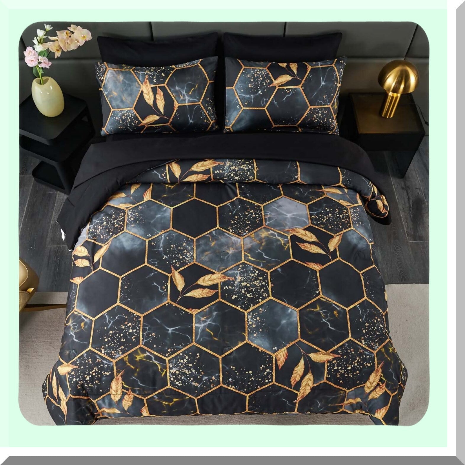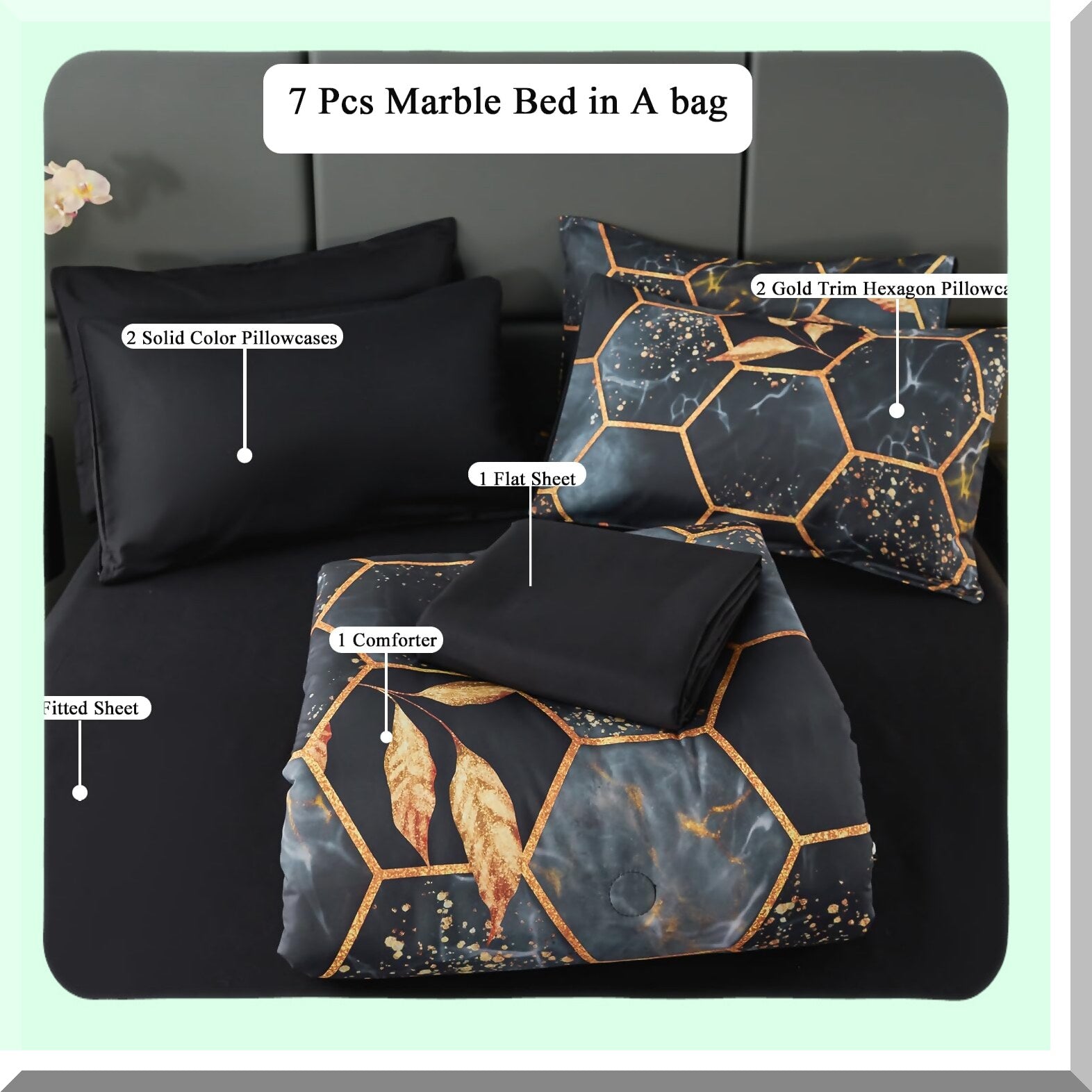 HexaGold 7-Piece Full Size Comforter Set - Geometric Black and Gold Bedding Set with Watercolor F Print, Includes Comforter and Sheets