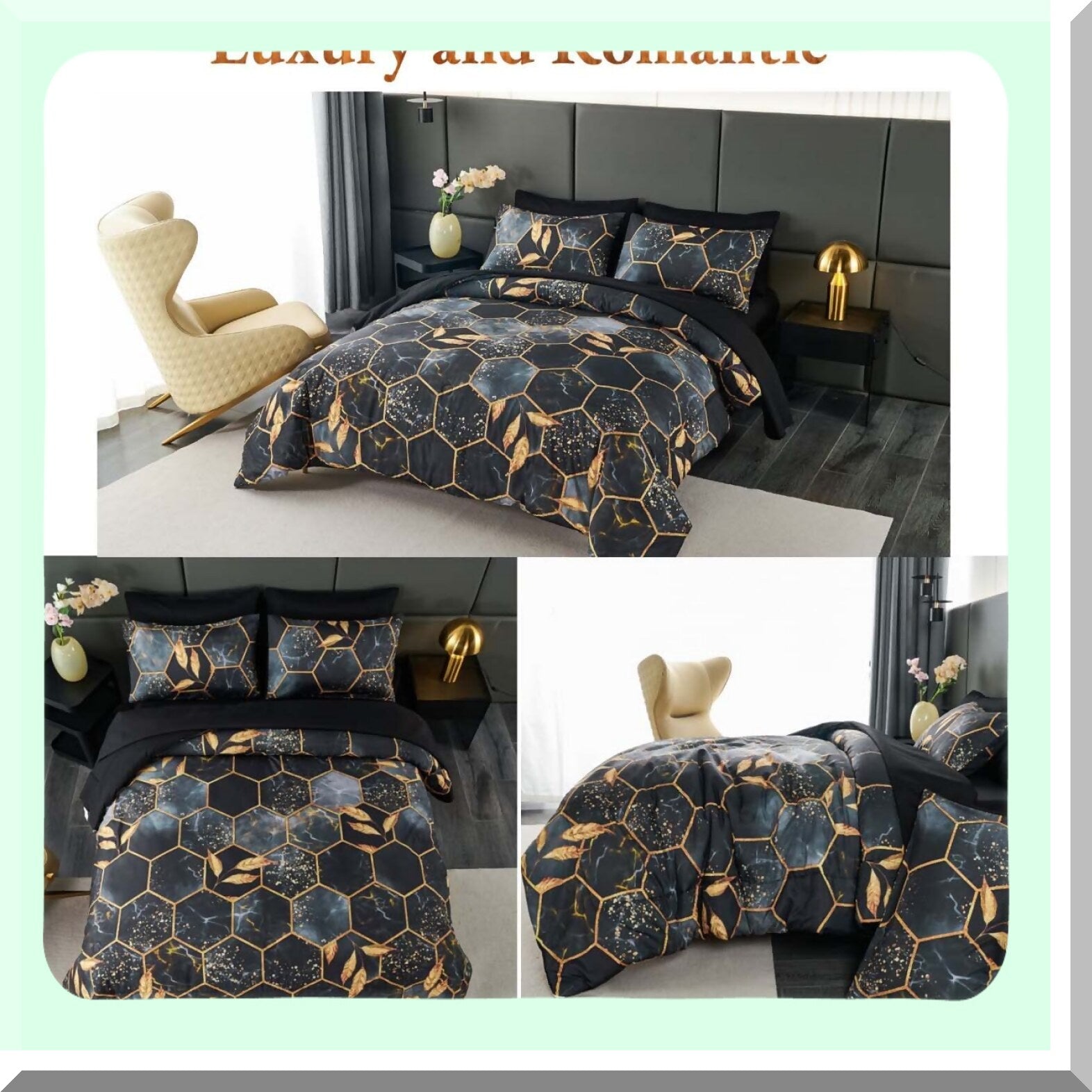 Experience the ultimate luxury with our black gold comforter set, crafted from premium quality brushed microfiber material. The soft microfiber inner fill provides unparalleled comfort and warmth, ensuring a restful night's sleep every time. Upgrade your bedroom with this elegant and cozy set, perfect for adding a touch of sophistication to any decor. Treat yourself to the best in bedding with our exclusive comforter set.