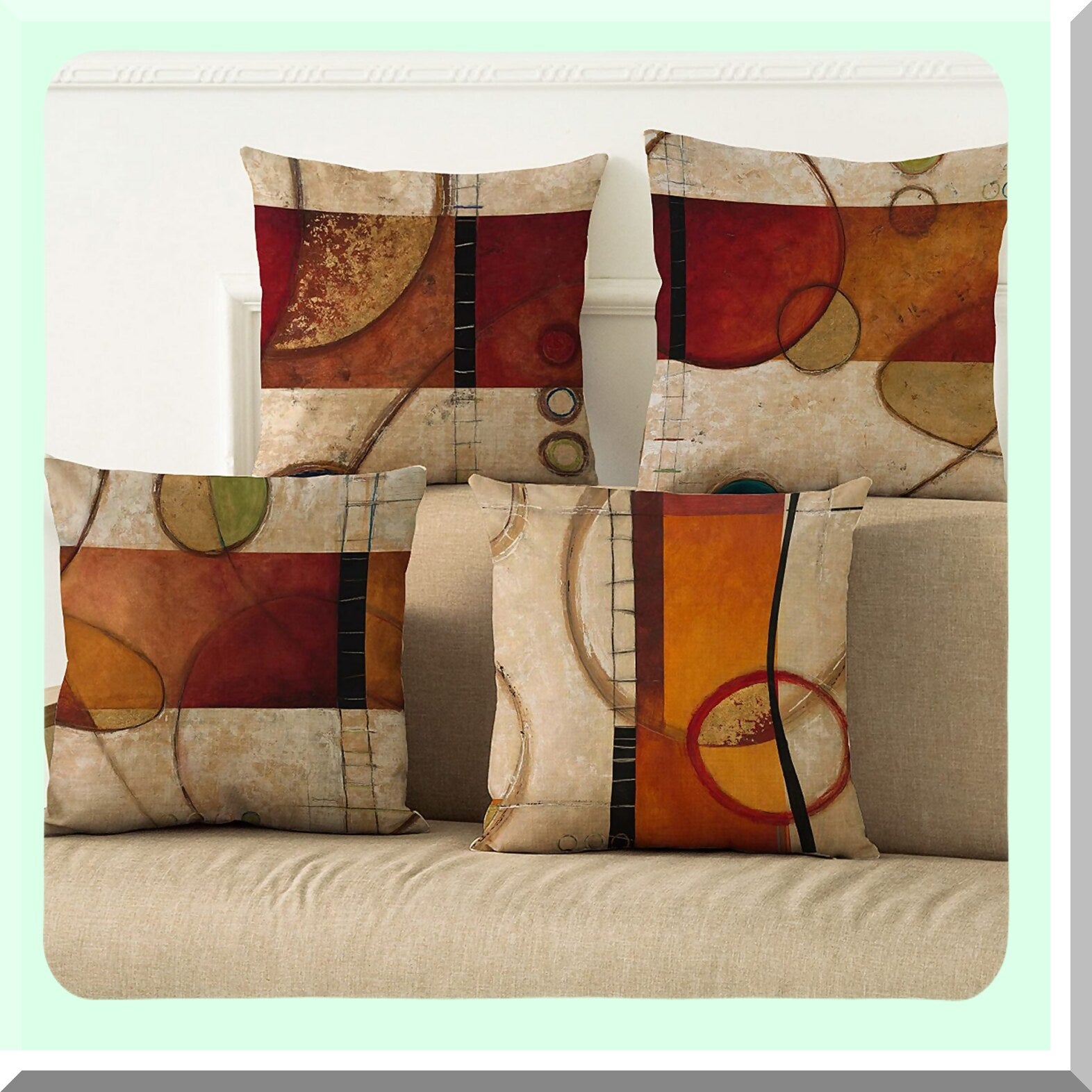 Vintage Abstract Fall Winter Pillow Covers - Set of 4 Square Burlap Cushion Cases 18x18 Inch for Living Room, Couch, and Bed - Brick Red Circle Design