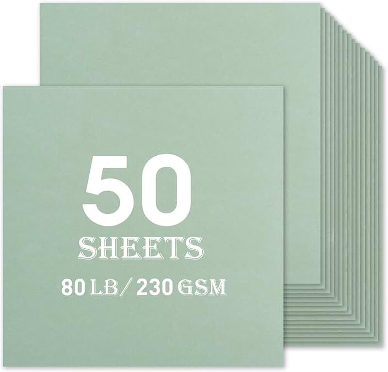A pack of 50 sheets of sage green cardstock measuring 12 inches by 12 inches. Each sheet has a weight of 230 GSM, making it suitable for various craft projects. Ideal for scrapbooking, card making, and other DIY crafts, this sturdy cardstock can be used with printers and cutting machines. It provides a durable surface for creative projects and is suitable for a variety of artistic and decorative applications.