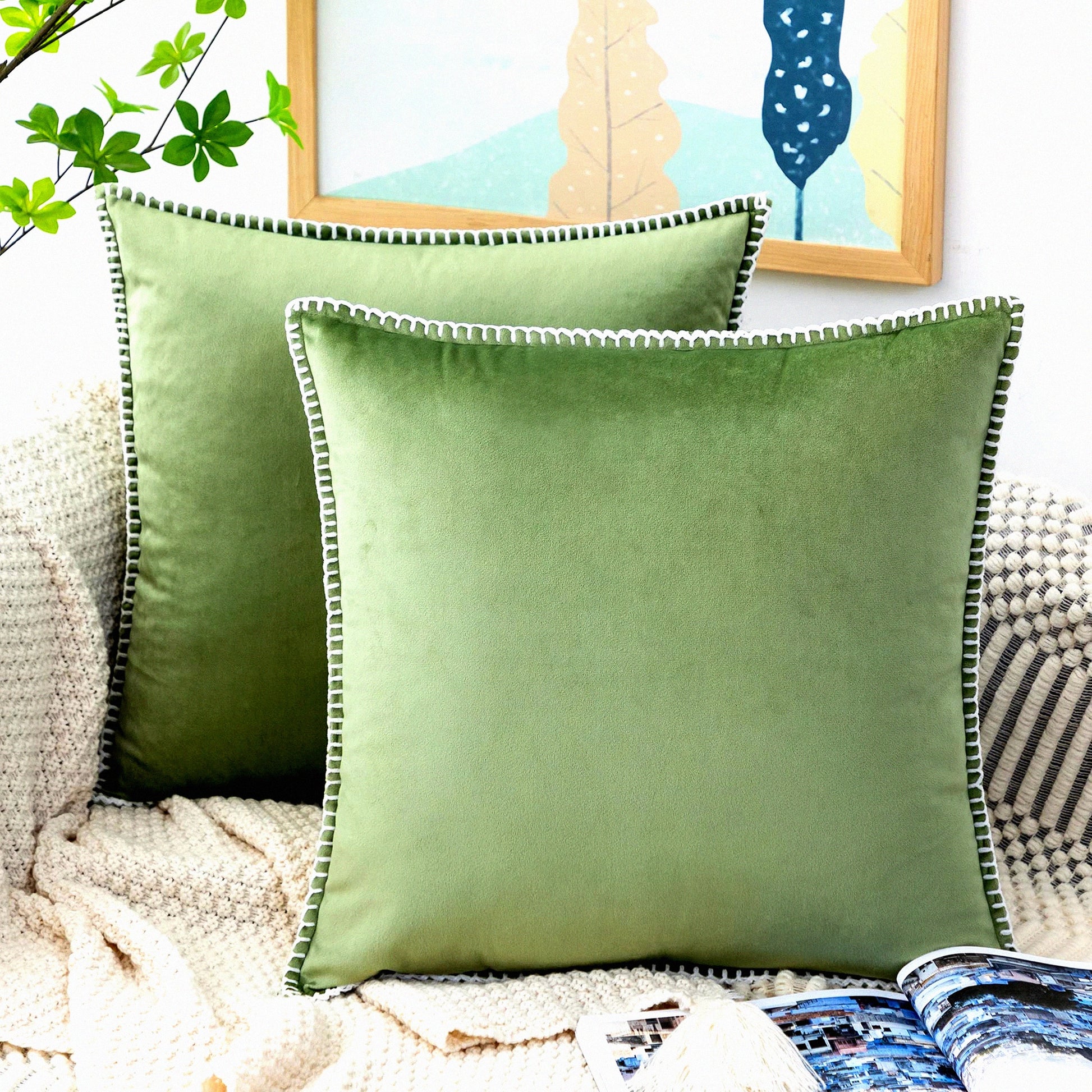 Velvet Farmhouse Square Pillow Covers - Set of 2, Soft Cushion Cover for Sofa Couch, Living Room, Bedroom - Sage Green Decorative Throw Pillowcase 18" x 18"