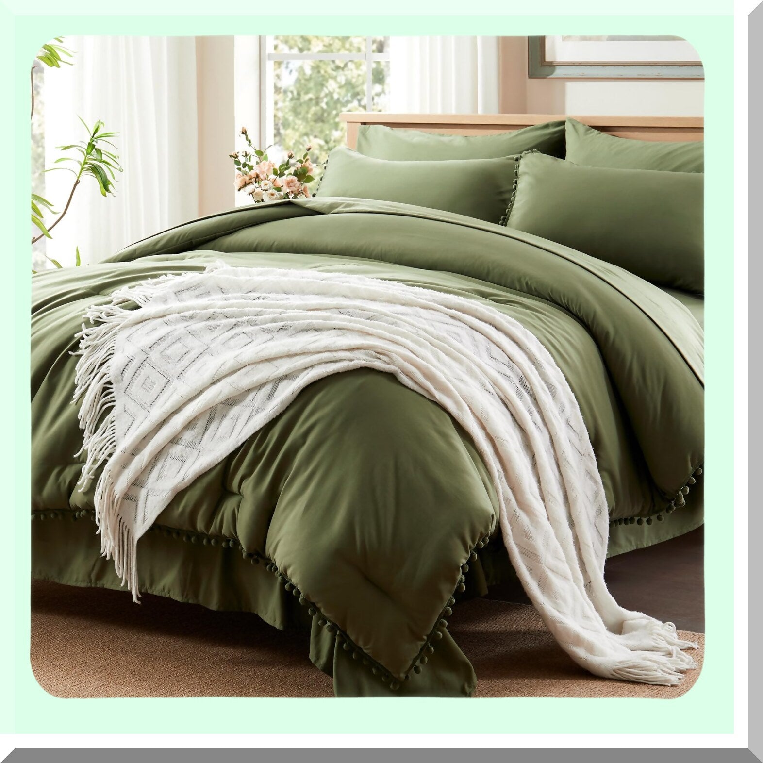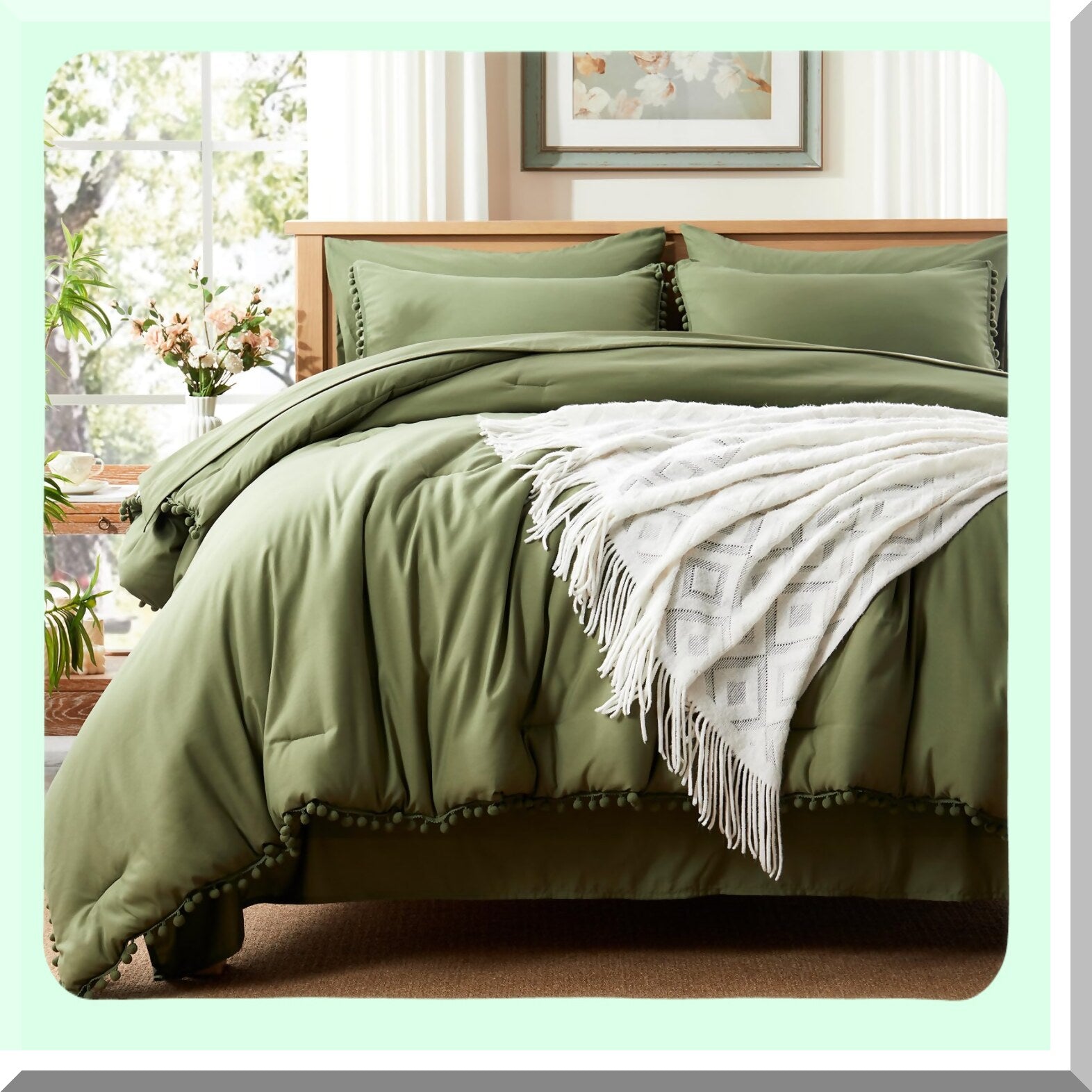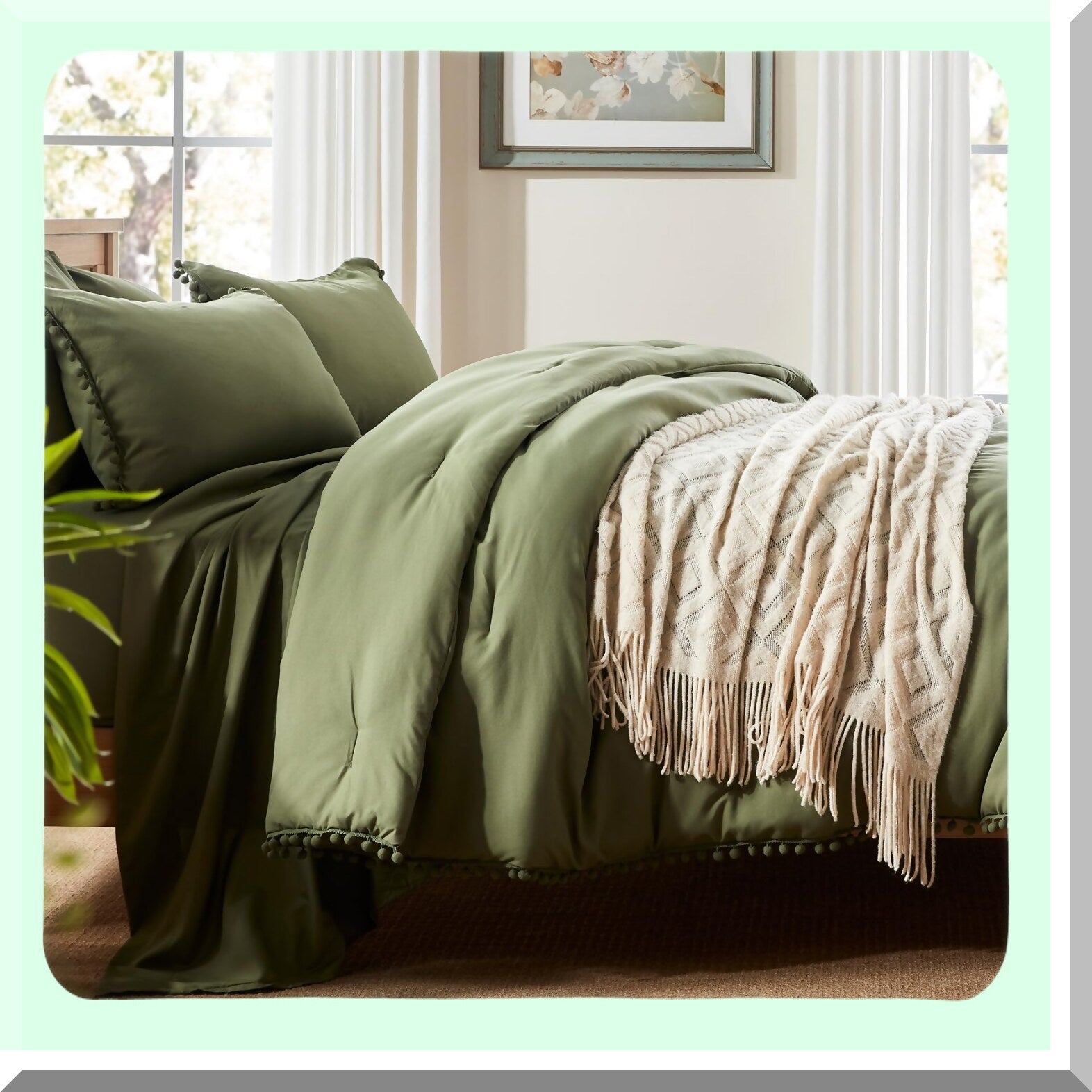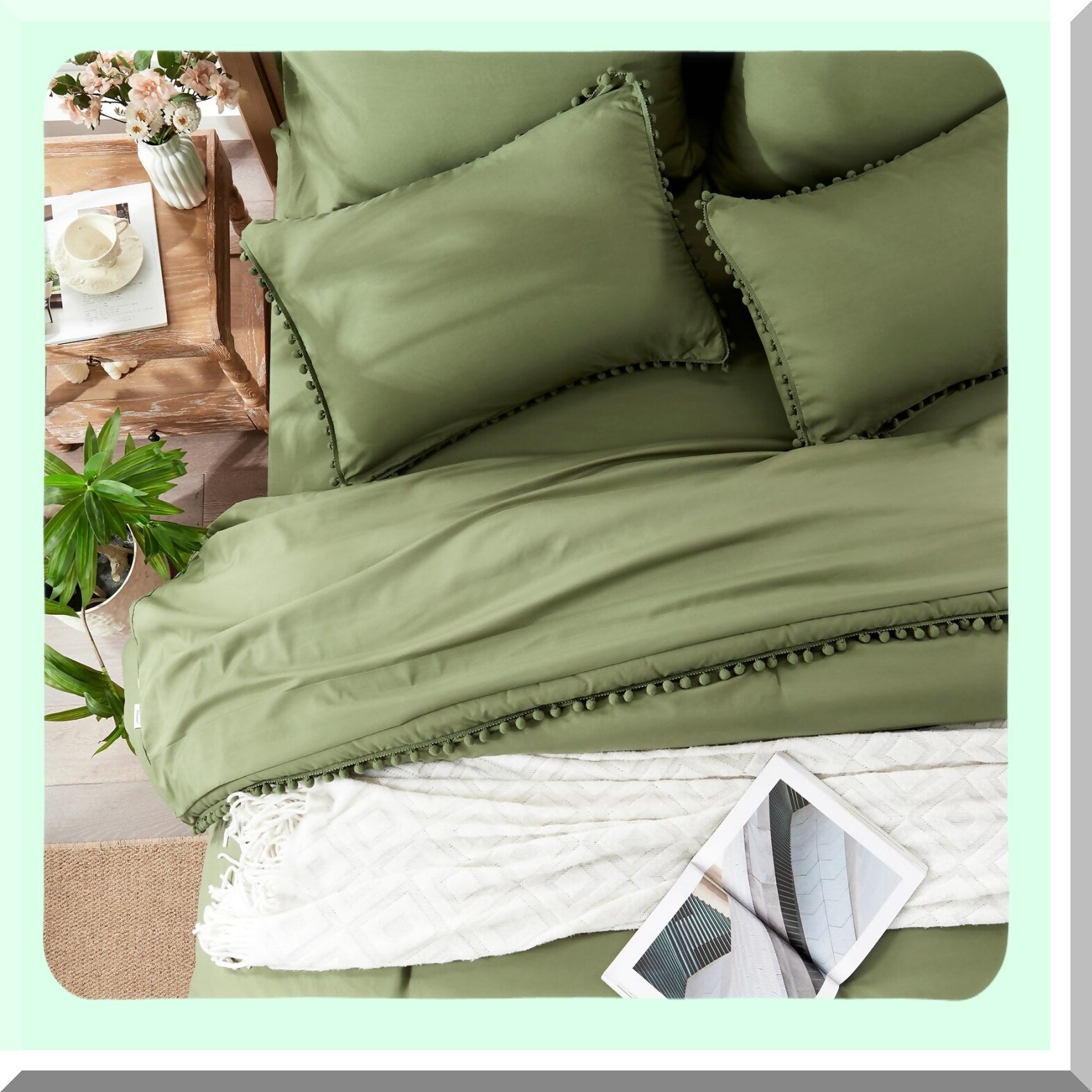 Boho Olive Green Pom Pom Comforter Set - 5 Piece Bed in a Bag with Sheets - Twin Size Bedding Set - Includes Comforter, Sham, Pillowcase, Flat Sheet, Fitted Sheet