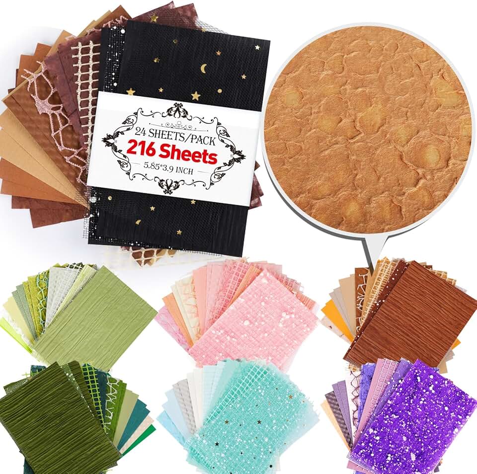 This set includes nine packs of textured scrapbook paper, totaling 216 sheets. Each sheet measures approximately 5.85 by 3.9 inches and features a mesh fabric texture. The collection offers a variety of vintage-style designs suitable for scrapbooking, journaling, decoupage, painting, greeting cards, and other craft projects. The special material and mixed patterns provide a unique look and feel, making them ideal for creative DIY activities.