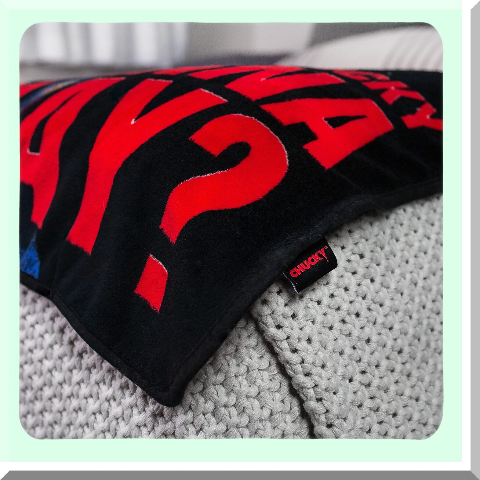 Introducing the Universal's Chucky Wanna Play" Raschel Throw Blanket, a must-have for all horror enthusiasts! This unique blanket features the iconic possessed doll Chucky, complete with his signature blade and chilling catchphrase. Made from 100% polyester microplush fleece, this blanket is incredibly soft and cozy, perfect for year-round use. Measuring 50x60 inches, it's machine washable for easy care. Show your love for Chucky with this officially-licensed product from a trendsetting company in NYC. Embrace your inner fan(atic) with this innovative and detail-oriented blanket that is sure to make a statement in any room.