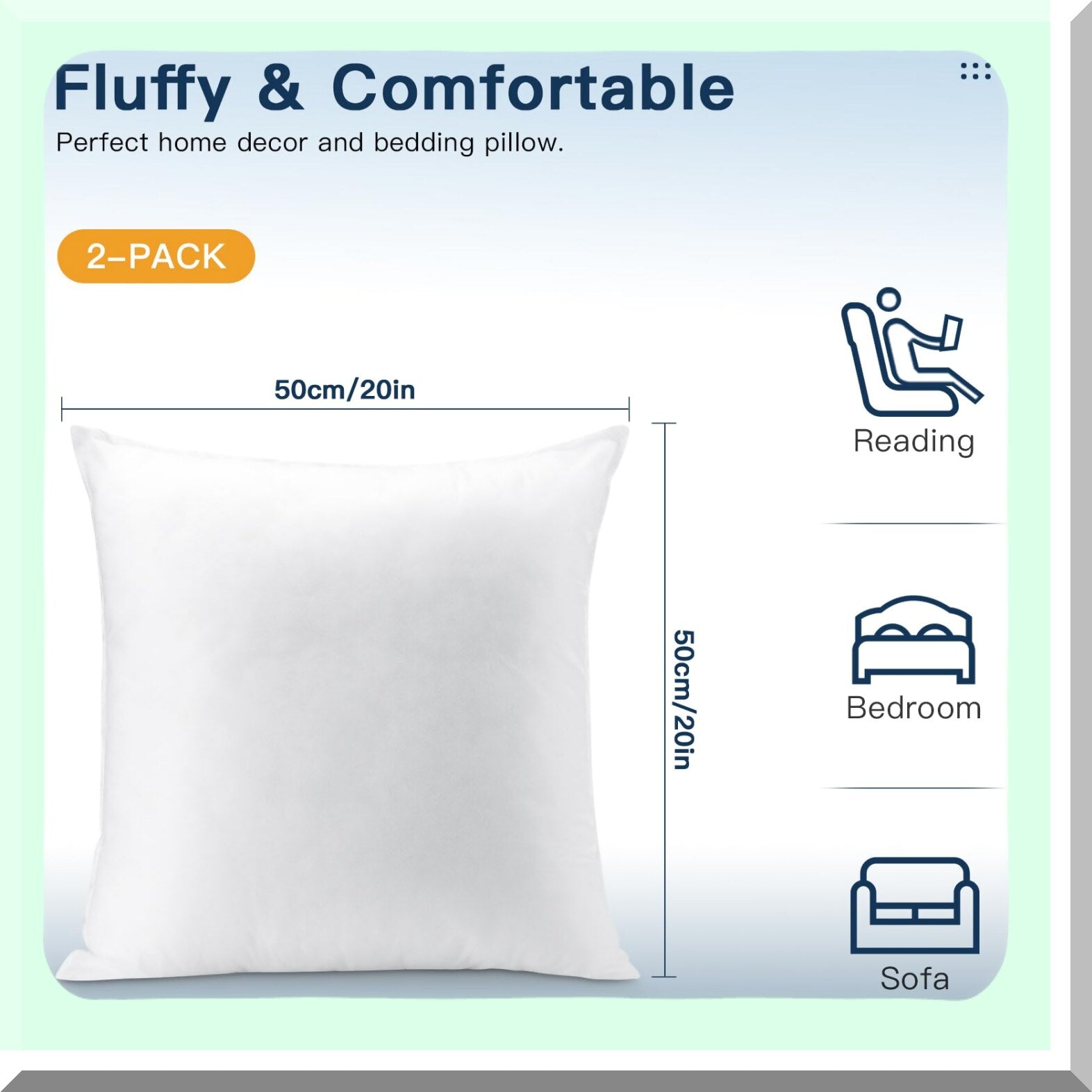 The practical benefits of this product include the convenience of receiving two pillow inserts measuring 20x20 inches or 50x50 cm. This ensures that users have the correct size inserts for their pillows without the need to search for or purchase them separately. This saves time and effort for users, providing a hassle-free solution for updating or replacing pillow inserts. The standardized size also ensures a proper fit for pillows, enhancing comfort and aesthetics in any living space.