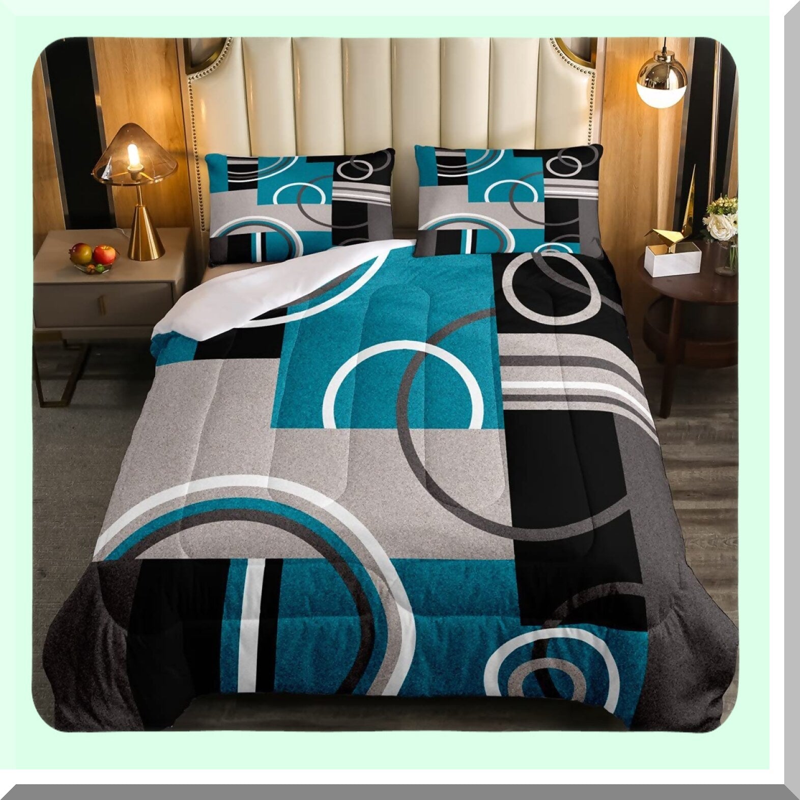 Turquoise Stripe Geometric Comforter Set - Full Size Retro Circle Swirls Bedding with Modern Abstract Texture & Color Art Duvet - Gray Black Blue