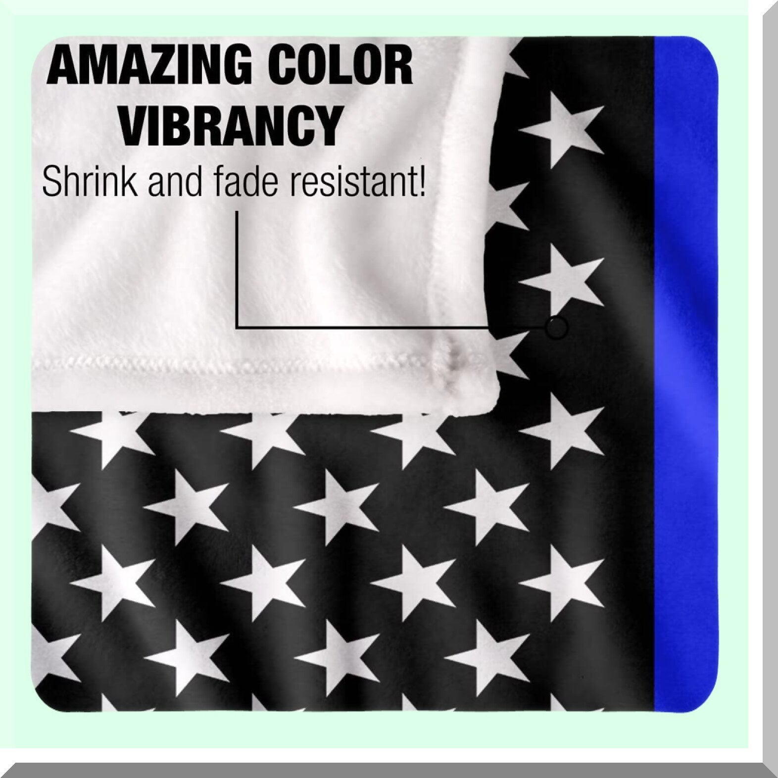 Wrap yourself in comfort and patriotism with this officially licensed Thin Blue Line flag throw blanket. Made from silky touch super soft material, this 50" x 60" blanket is perfect for cozying up on chilly nights or displaying as a statement piece in your home. Show your support for law enforcement with the unique Thin Blue Line design, making it a great gift for police officers or their families. Stay warm and stylish with this high-quality, licensed throw blanket.