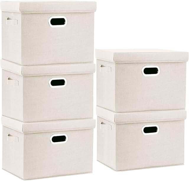 Set of five large fabric storage bins with lids, designed for organizing various household items. Each bin measures approximately 17.3 x 11.8 x 11.4 inches, providing ample space for clothing, toys, or accessories. The collapsible design allows for easy storage when not in use, saving space. Made from durable, washable fabric, these bins are easy to clean and maintain. The neutral beige color complements different home decors, making them suitable for bedrooms, closets, or storage rooms. The sturdy lids help keep contents protected from dust and dirt, while the lightweight construction makes them easy to move and handle. Ideal for decluttering and maintaining an organized living space, these versatile storage boxes are practical and functional for everyday use. Their simple design and reliable construction make them a convenient solution for home organization needs.