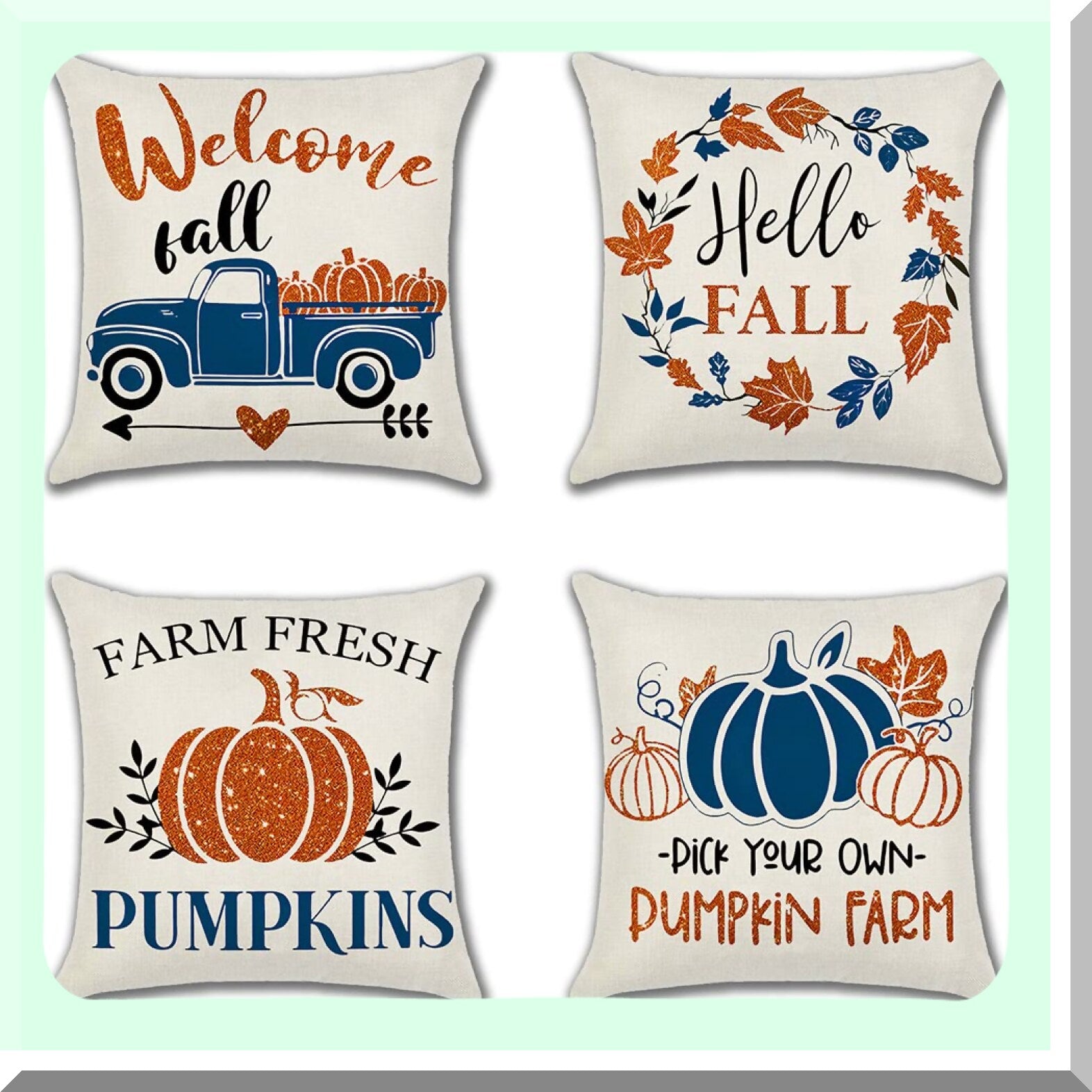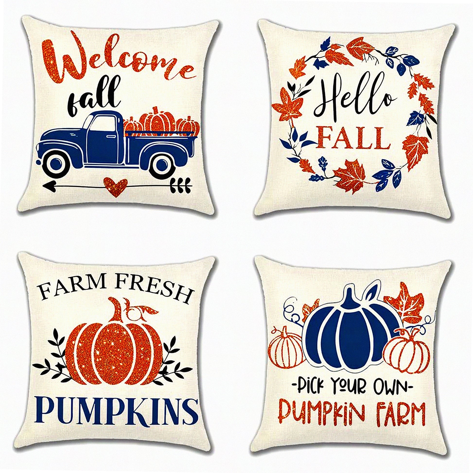 Autumn Harvest Pillowcase Set - 18x18 Inch Pumpkin & Maple Leaf Decorative Cushion Covers for Fall Home Decor - Farmhouse Sofa Pillow Covers - Set of 4