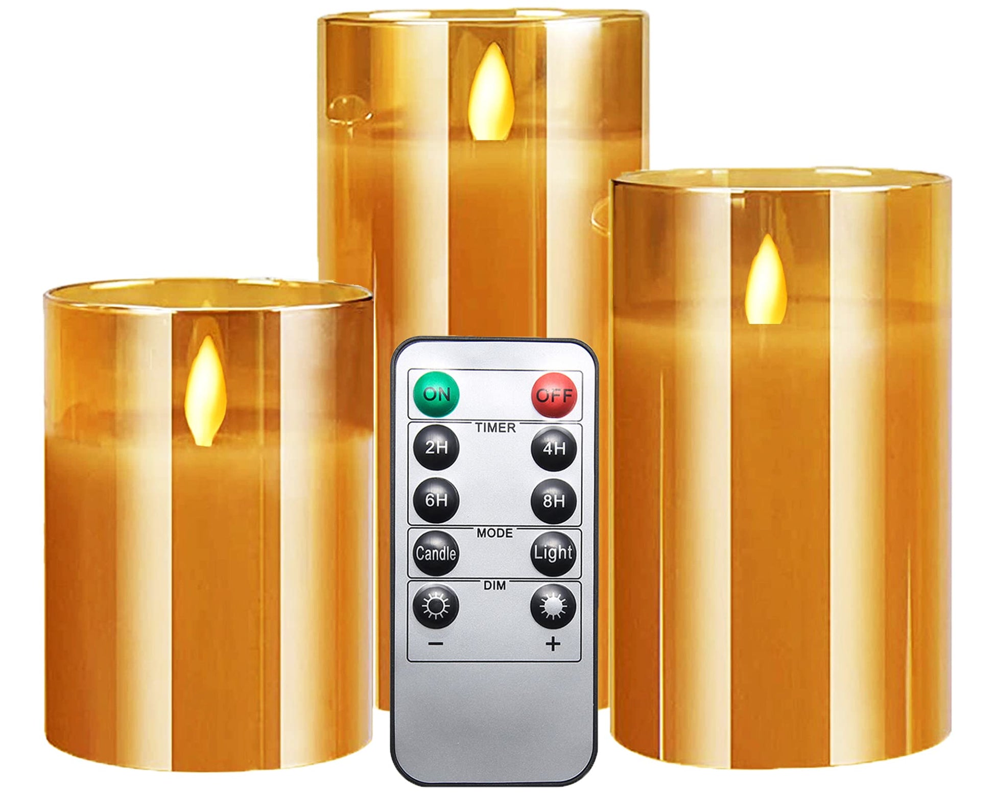 Gl LED Flameless Pillar Candles Battery Operated with Flickering Moving WicksColor: AmberPackage Included:- 1 x LED Candle Size: D 3" x H 4")- 1 x LED Candle Size: D 3" x H 5")- 1 x LED Candle Size: D 3" x H 6")- 1 x Remote Control- 1 x User Manual RomanticRealisticFlickeringThe appearance of the real wax covered and flickering moving wicks be easy to create the sense of romantic.Whether the modes of lights or the timer, the 10-button remote can allows flameless candles to meet your daily needs.Suit for weddings, table, fireplace, and so on.Not Waterproof