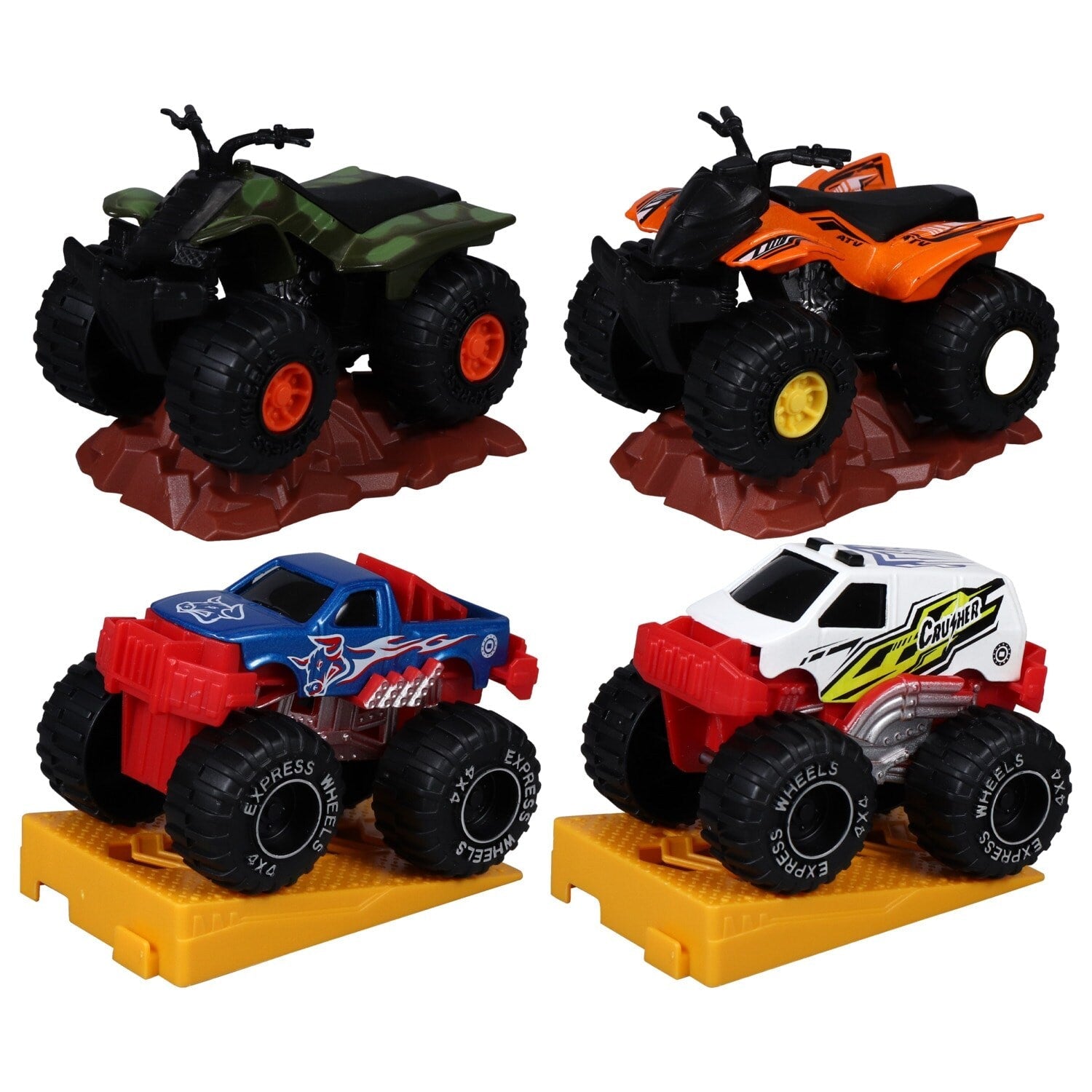 Comes with (Pack of 36). Your little one will love playing with these Assorted Monster Truck and ATV Toys! Assorted among ATVs on rocks in orange and black or dark green and black, and monster trucks on yellow inclines in blue and red or white and red, these toys are great for playing at home, in daycare centers, and in the car, or for resale in toy stores!