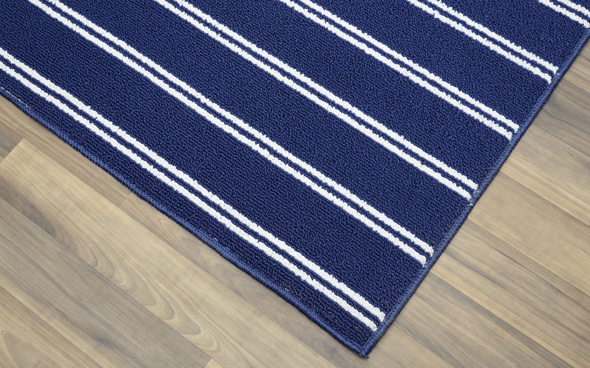 Designer rugs do not have to break the bank. Avery by is a classic pin stripe design that never goes out of style. Great for that first apartment, college dorm room, living room, office, or any room needing a classic update. Avery is machine tufted low pile loop in Olefin yarn on 100% Latex non skid backing. Soil & stain resistant, and proudly made in the A. Rug will ship folded in a box. Fold marks will disappear after a few days. Please note that size and color representation are subject to manufacturing variance and may not be exact. Also note that monitor settings may vary from computer to computer and may distort Actual colors. Photos are as accurate as possible; however, colors may vary slightly in person due to flash photography and differences in monitor settings. Each rug/carpet is manufactured with the same colors as pictured; however they can be manufactured from slightly different "Dye lots". Meaning when the yarn is dyed it can vary in shade ever so slightly.