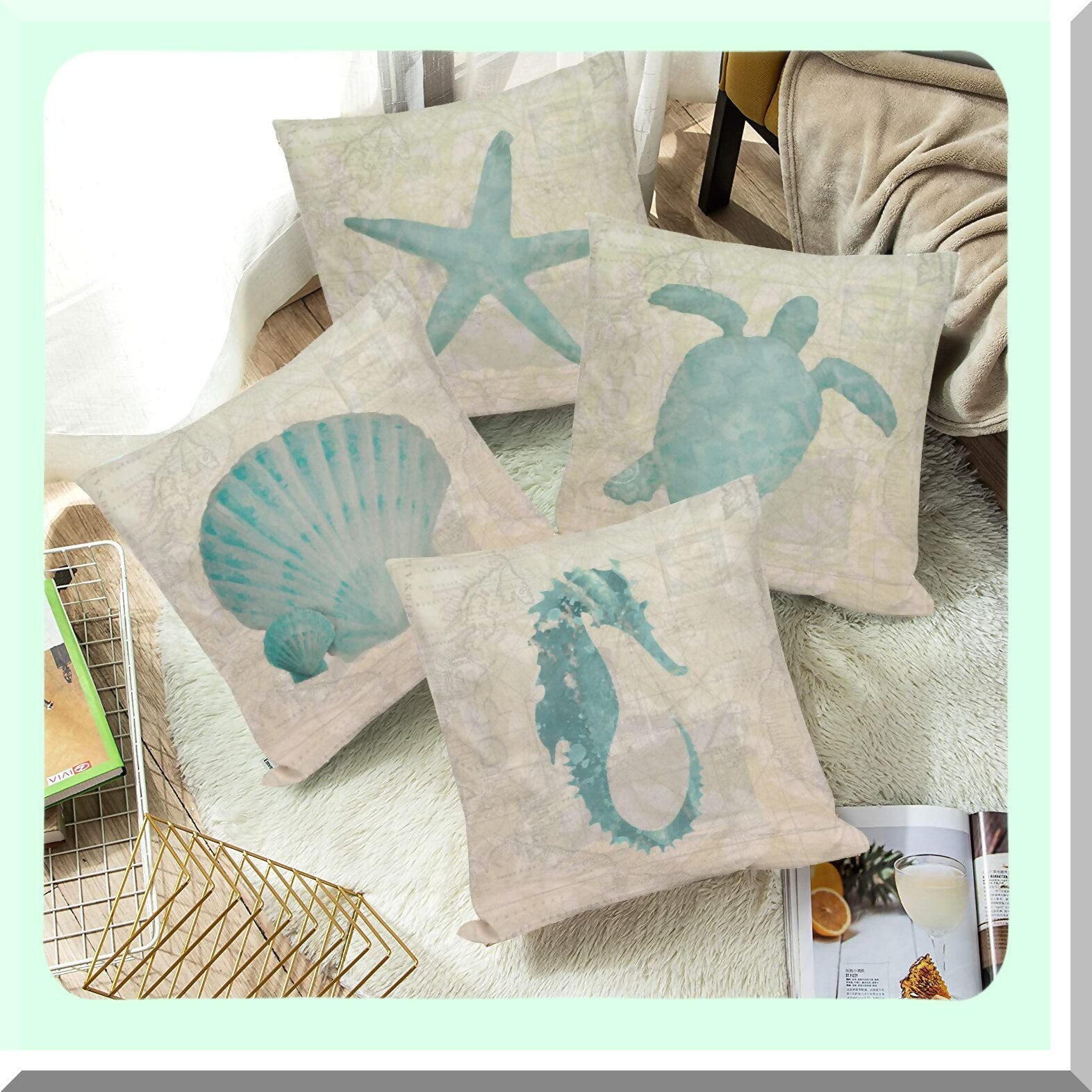 Nautical Summer Decor Pillow Covers - Set of 4 Ocean Beach Starfish SeaTurtleSeahorse Scallop Shell WorldMap Throw Pillow Cases 18x18 - Vintage Coastal VO-Ocean