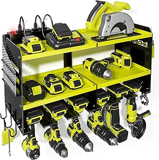 This power tool organizer is designed for quick assembly in just 15 minutes and can support a maximum load of 420 pounds. Made from heavy-duty metal, it provides a sturdy and durable storage solution for your garage or workshop. The organizer features six slots specifically designed to hold cordless drills securely, helping to keep your workspace tidy. It also includes a four-outlet power strip, allowing convenient access to electrical outlets for charging and powering tools. The compact design makes it suitable for various storage needs, helping to maximize space and improve organization. Ideal for use during holidays or everyday workshop activities, this organizer offers a practical solution for maintaining an efficient and clutter-free environment. Its robust construction ensures long-lasting performance, making it a reliable addition to any workspace.