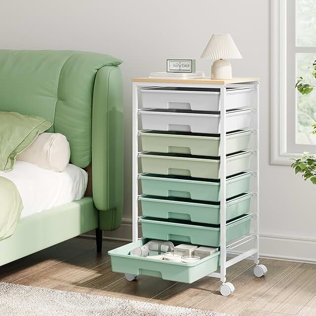 This storage cart features eight spacious drawers, providing ample space for organizing supplies, tools, or personal items. The white drawers are complemented by a sturdy wooden tabletop, offering a durable surface for various tasks. Its versatile design makes it suitable for use in classrooms, offices, craft rooms, or other organizational spaces. The cart's compact size allows for easy mobility and efficient use of space, helping to keep environments tidy and organized. The green accents add a touch of color, enhancing the aesthetic appeal of any setting. Ideal for teachers, students, crafters, or professionals, this storage solution combines functionality with a clean, modern look. The multiple drawers facilitate easy access and categorization of items, making it a practical addition to any workspace or home. Its durable construction ensures long-lasting use, supporting daily organizational needs with style and efficiency.