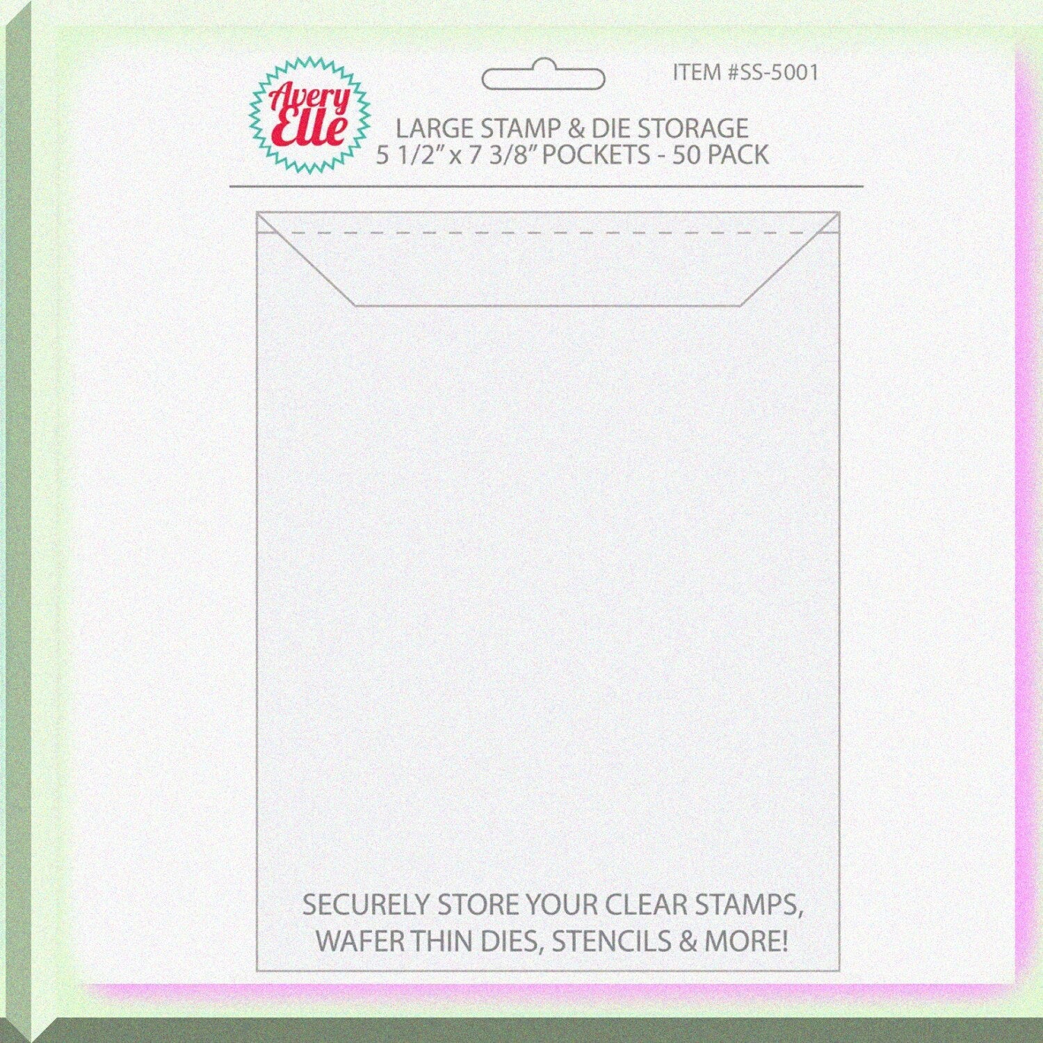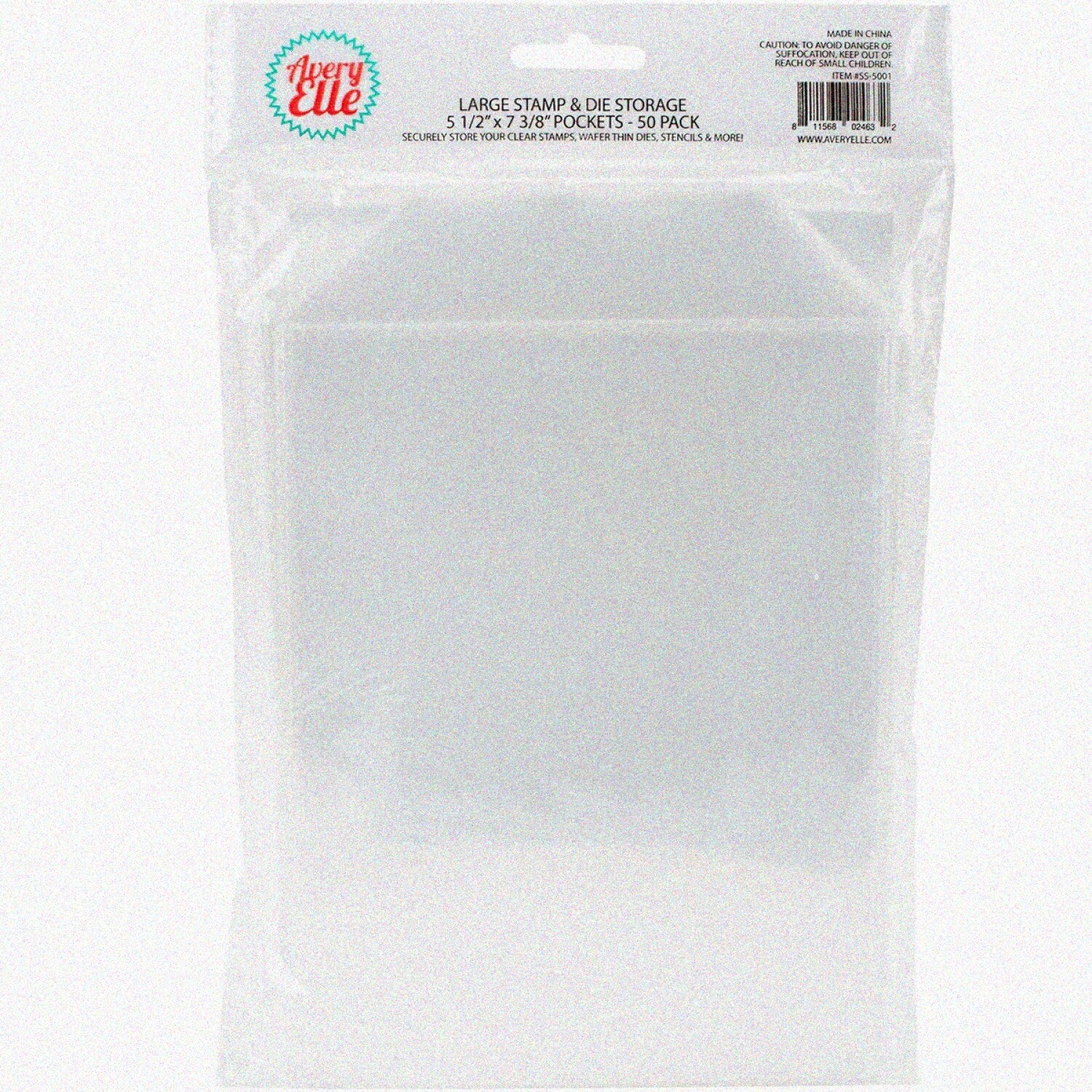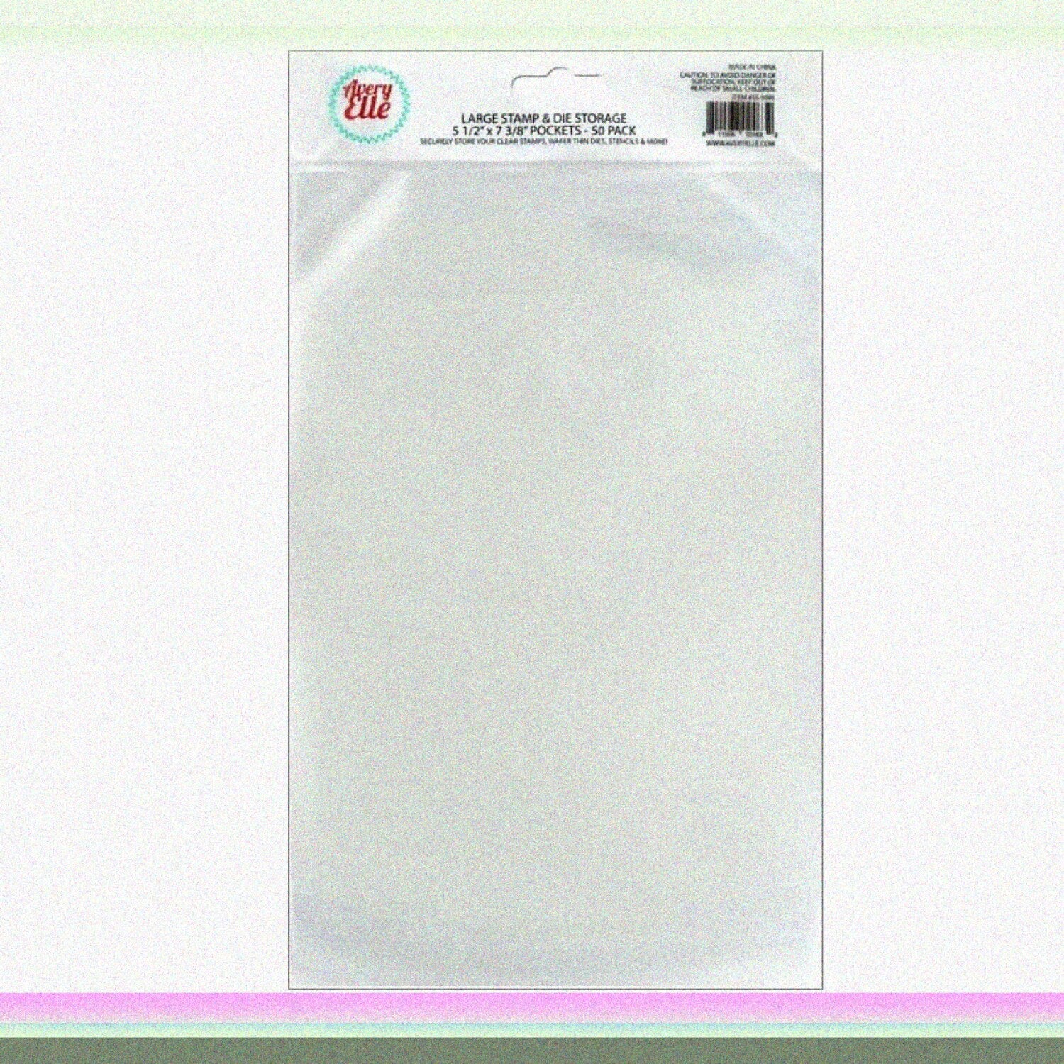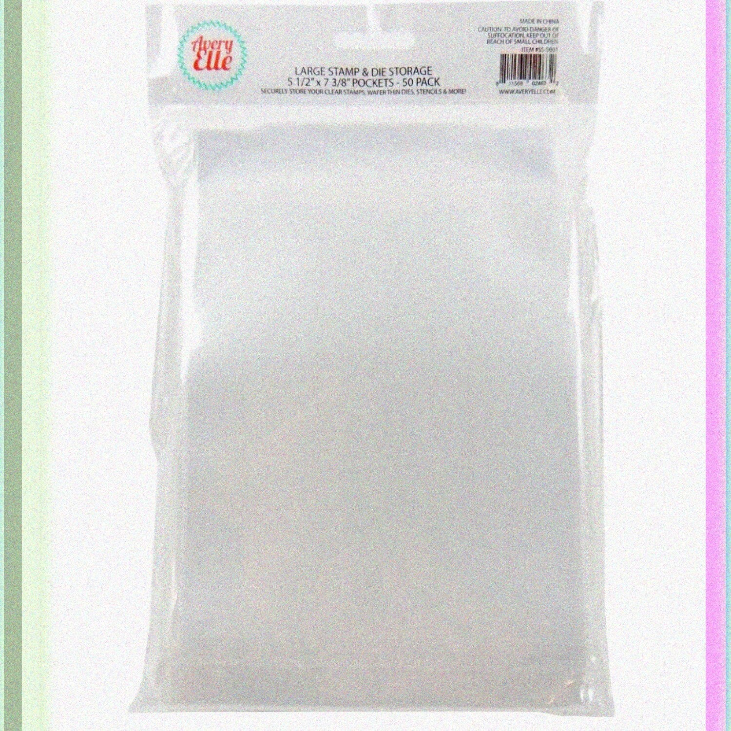 This package includes fifty large storage pockets measuring 5 x 7 3/8 inches, designed for organizing stamps and dies. Each pocket is made of clear material, allowing easy identification of contents without opening. The pockets are suitable for storing various sizes of stamps and dies, helping keep your crafting supplies neat and accessible. The set is ideal for maintaining an organized workspace and protecting your stamps and dies from damage. The pockets are imported and provide a practical solution for storage needs. With fifty pockets included, you can efficiently categorize and store multiple sets of stamps and dies, making your crafting process more streamlined. The large size ensures ample space for different stamp and die sizes, offering versatility for various projects. These storage pockets are a convenient addition to any craft room, helping you keep your supplies tidy and ready for use.